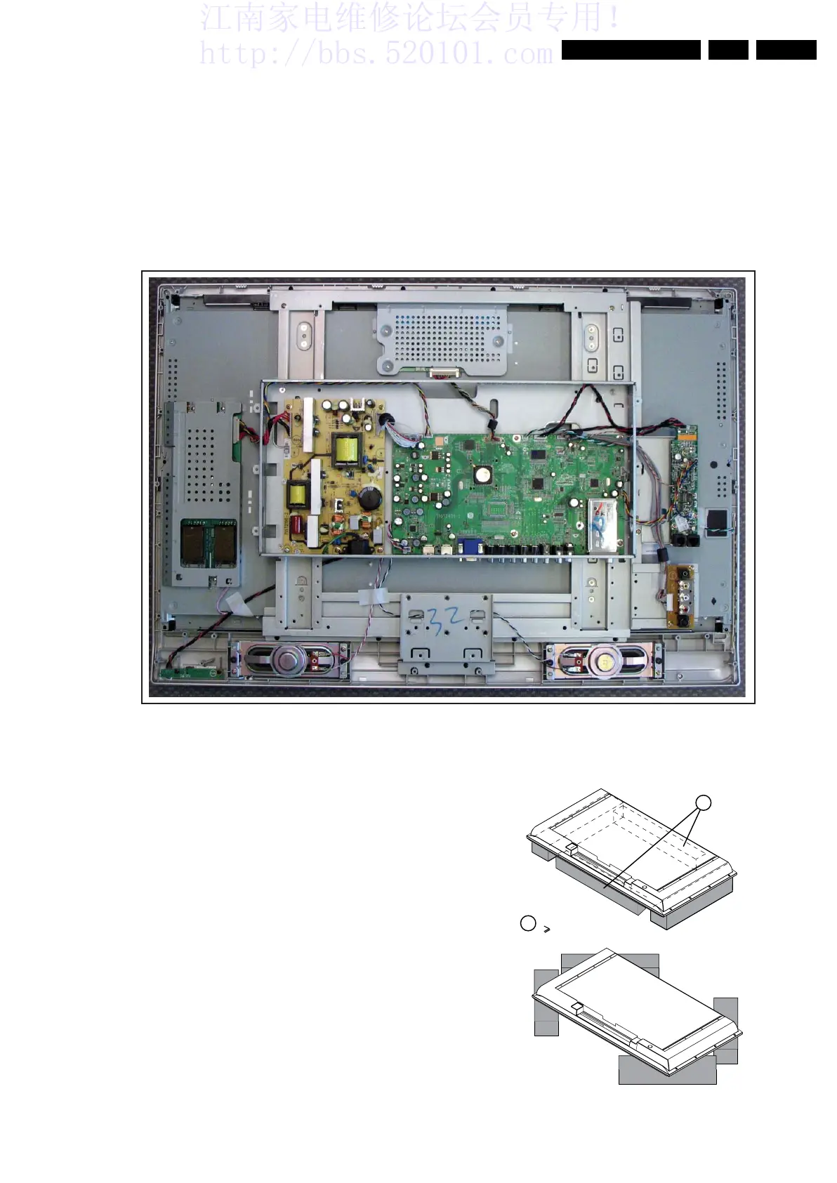 By laying the TV face down on the (ESD protective) foam bars,