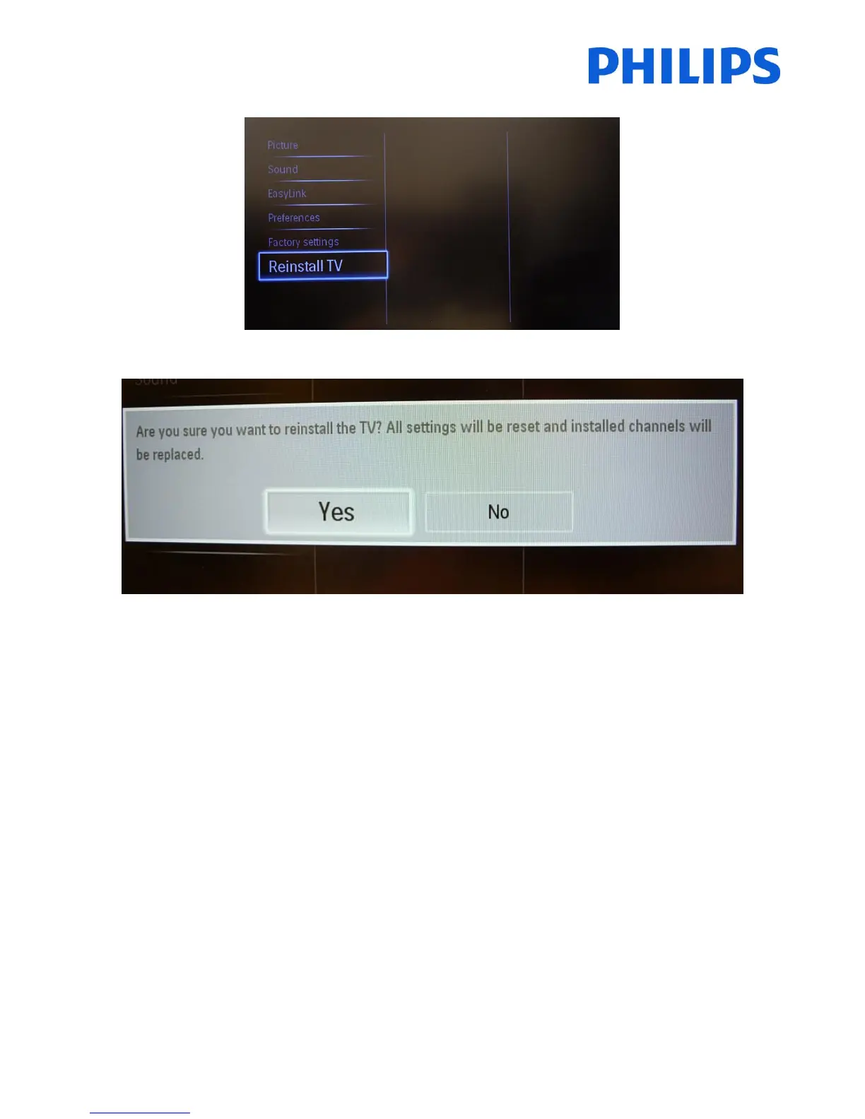 Press “OK” to access the sub-menu, navigate to “Reinstall TV”.