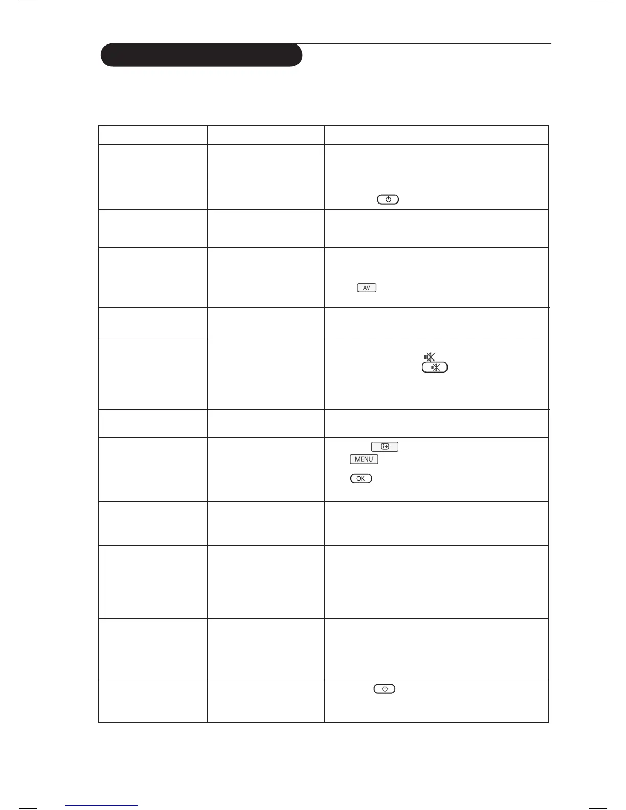 No display on screen • Faulty power supply • Check whether power cord is properly connected
