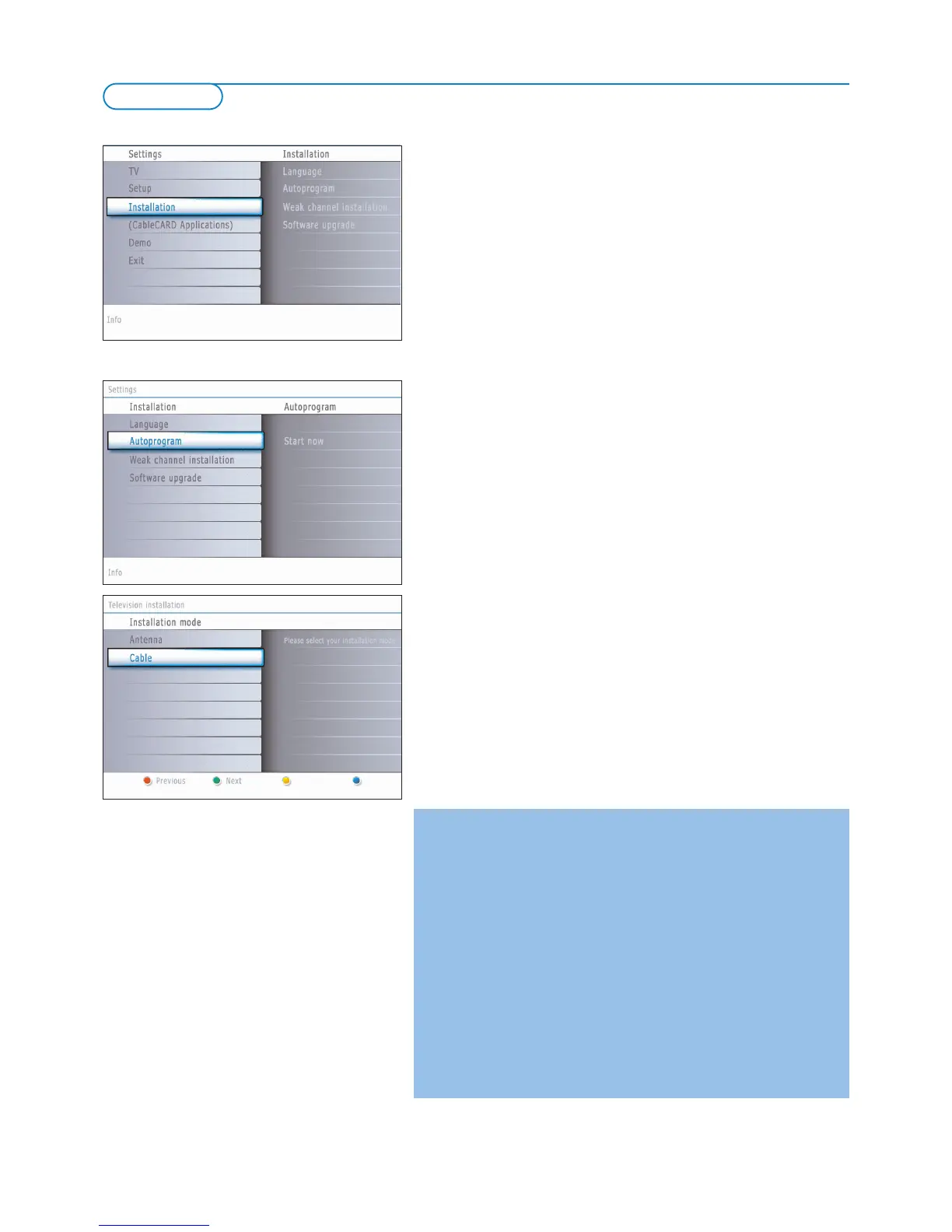 ‘ Select Cable or Antenna in the Installation mode.