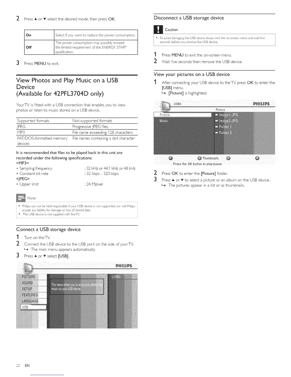 • To avoid damaging the USB device always exit the on screen menu and wait five