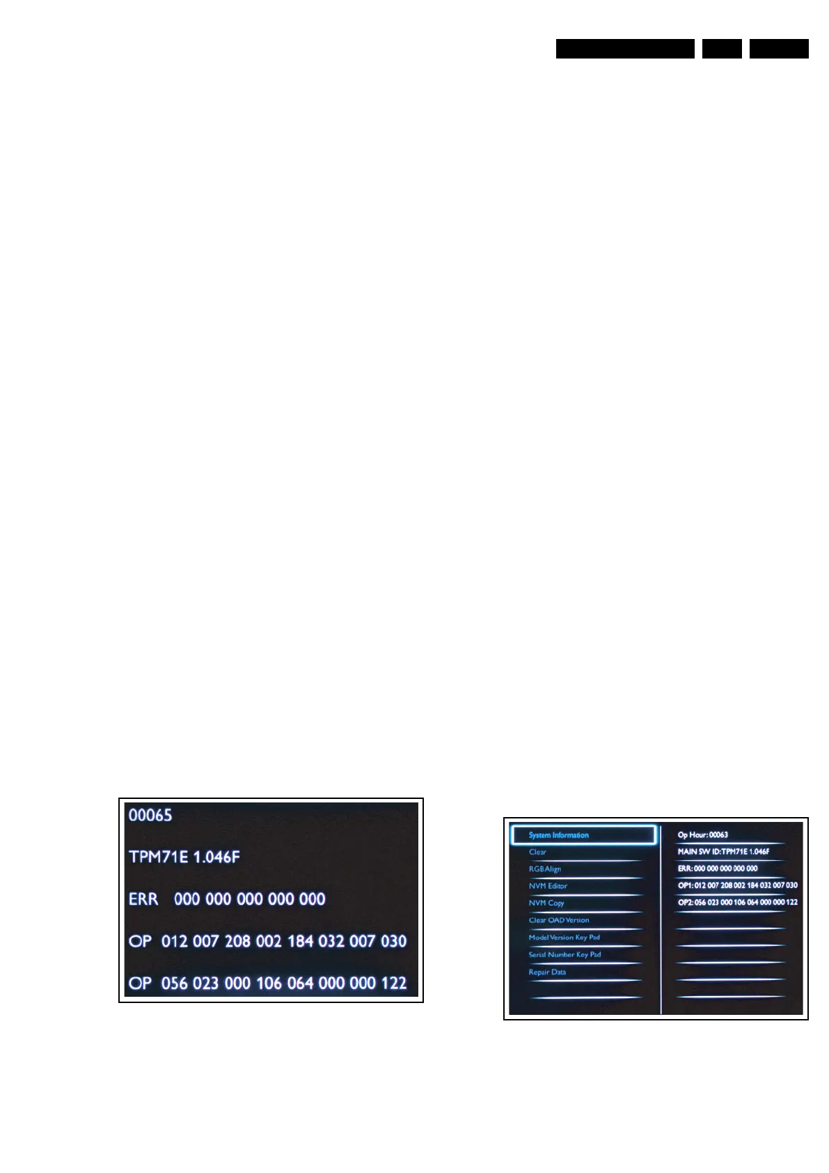 television is in Service Default Mode. Menu items and