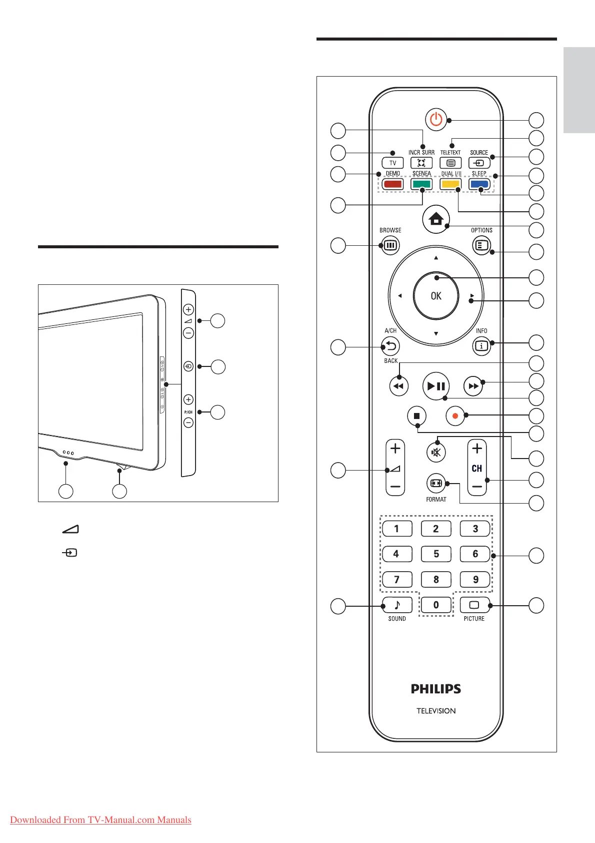 Power switch: Switches the TV on or