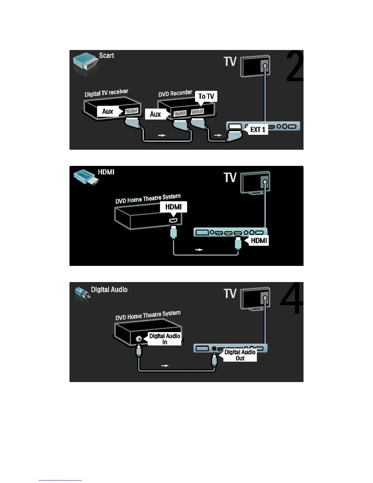 Finally, use a digital audio cinch cable to connect the Home Theatre System to the TV.