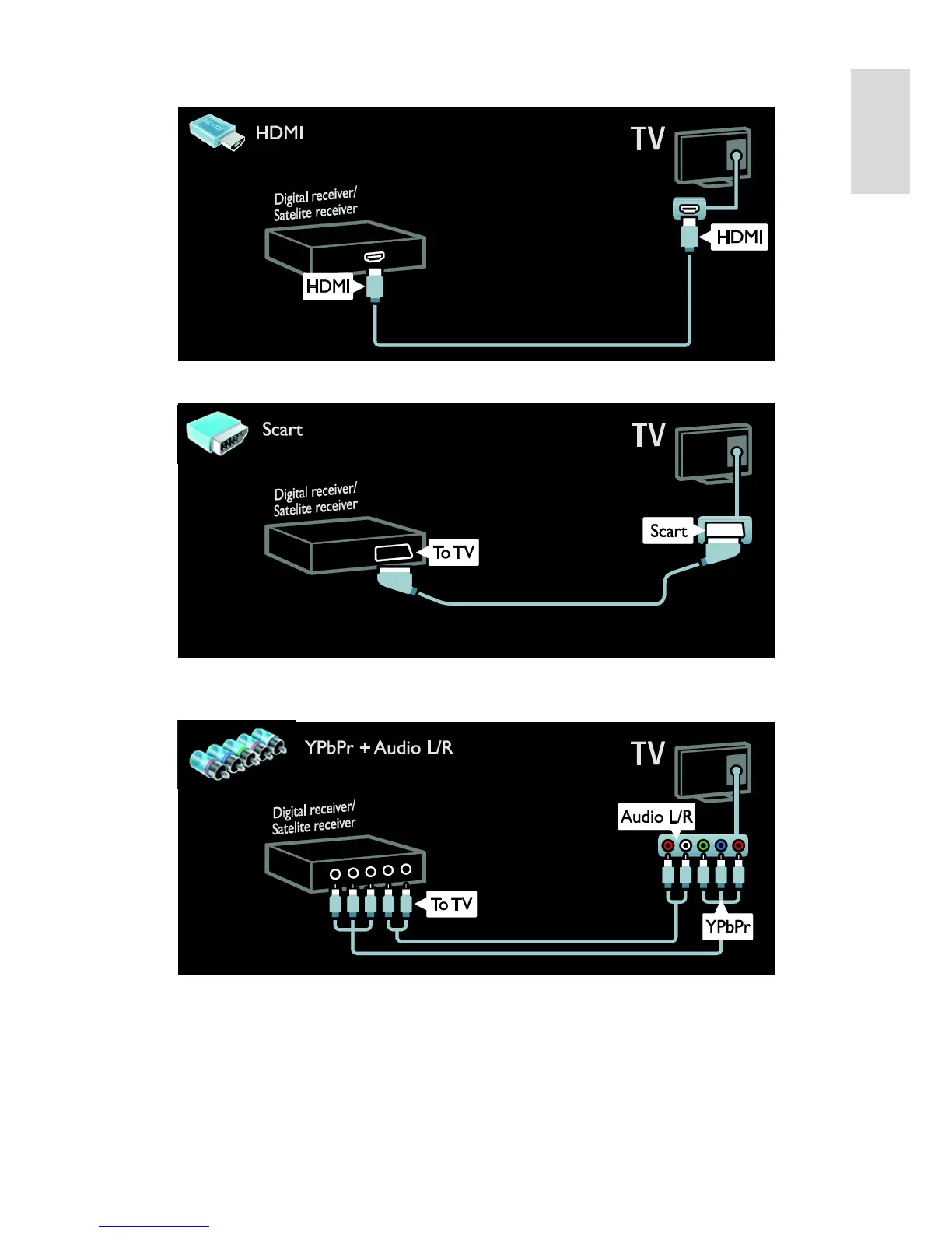 Connect the satellite or digital TV receiver with a SCART cable to the TV.