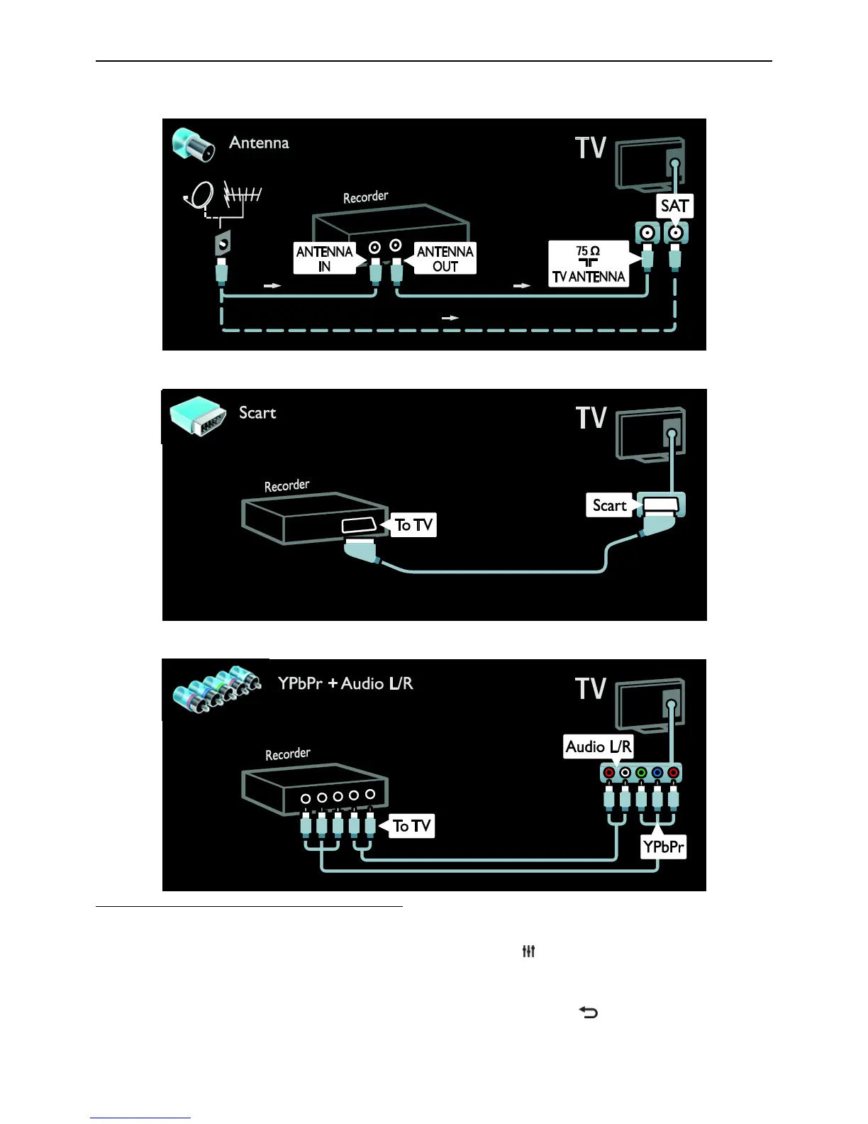 Connect the recorder with an antenna cable to the TV. (SAT is available on certain models only.)