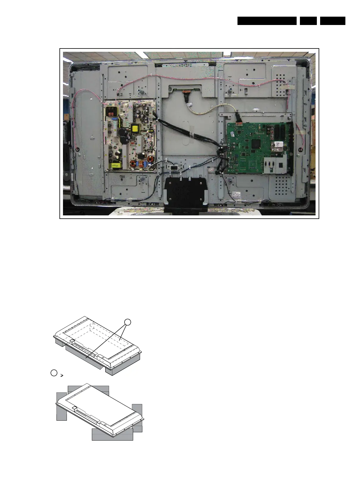 By laying the TV face down on the (ESD protective) foam bars,