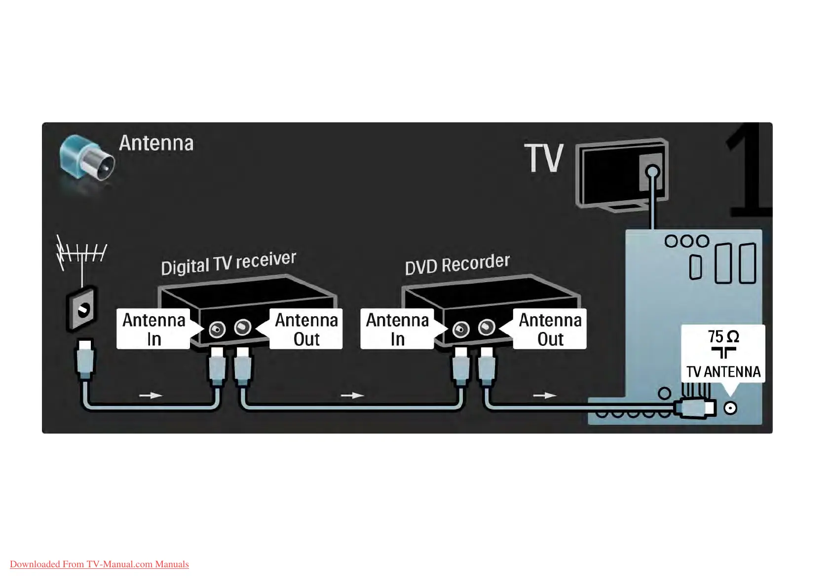 First, use 3 antenna cables to connect the digital receiver and the DVD Recorder to the TV.