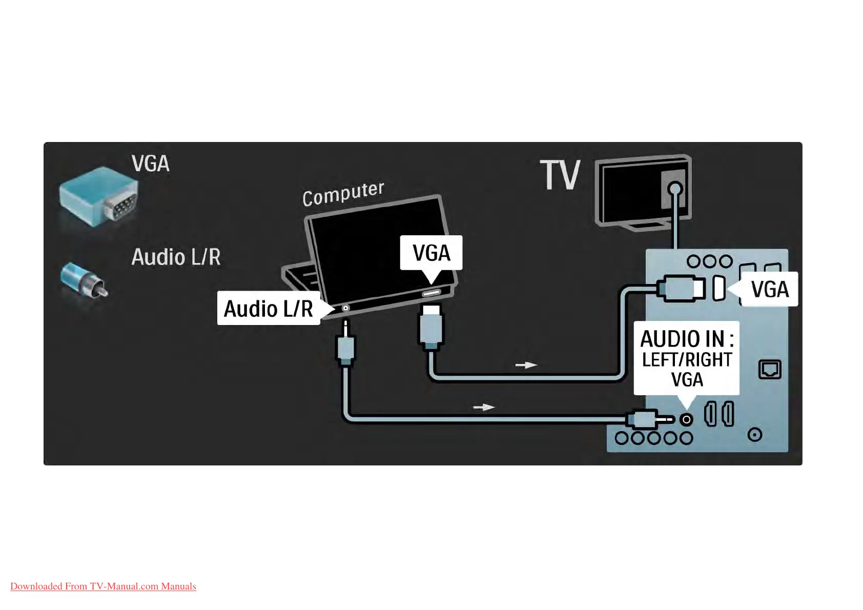 Use a VGA cable to connect the PC to the VGA connector and an audio L/R cable to connect the VGA Audio L/R to the back of the