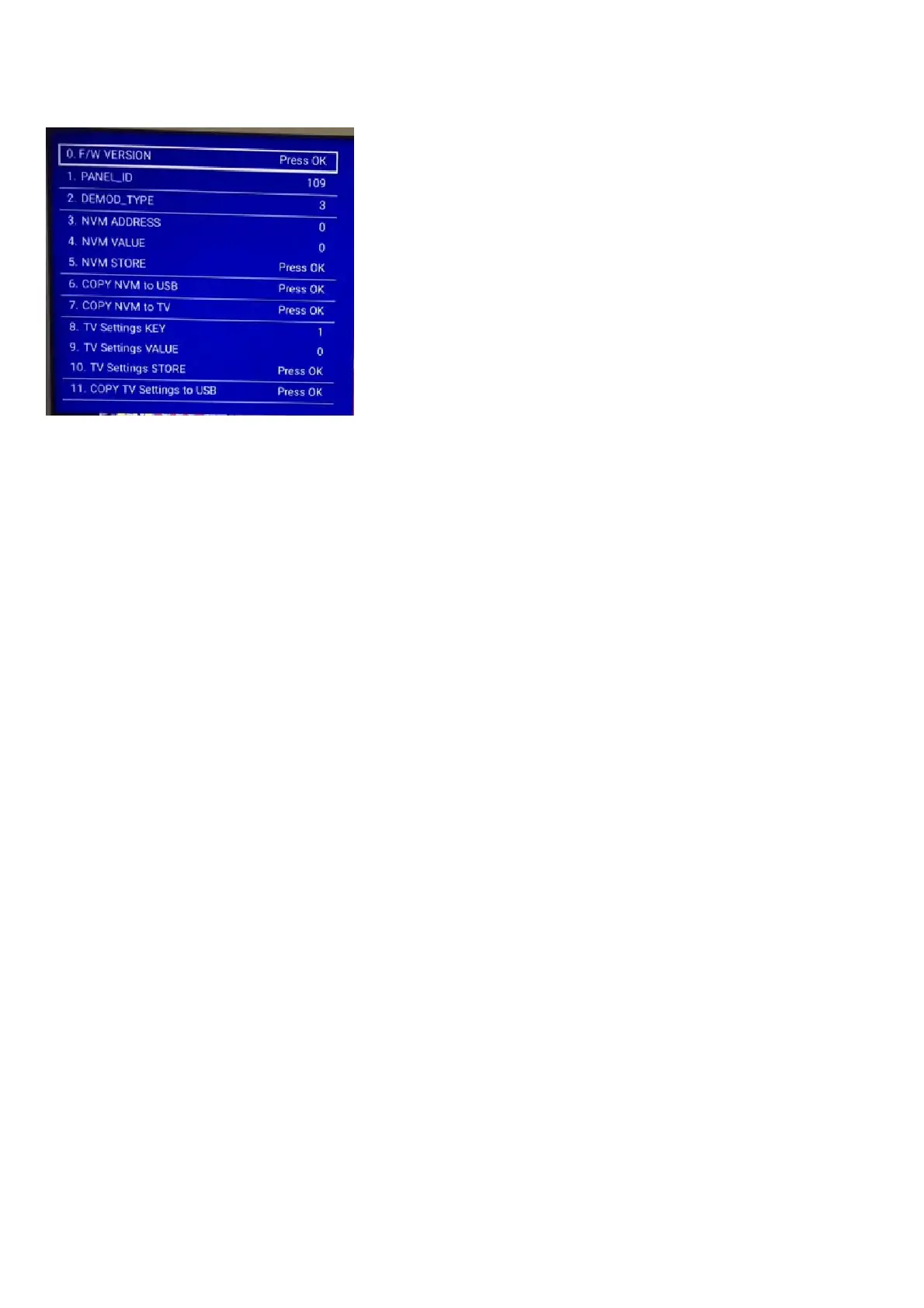 The Customer Service Mode shows error codes and information on the TVs operation settings.The call centre can instruct the customer (by telephone) to