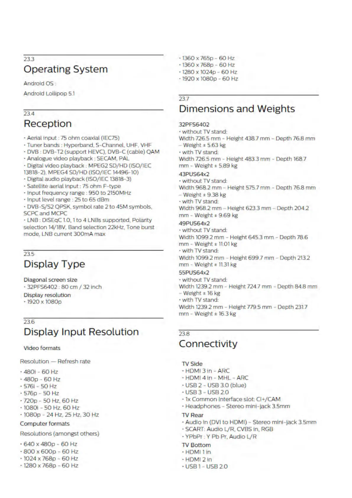Philips 32PFS6402/12 - Product Information; 23.3 Operating System; 23.4 Reception; 23.5 Display Type