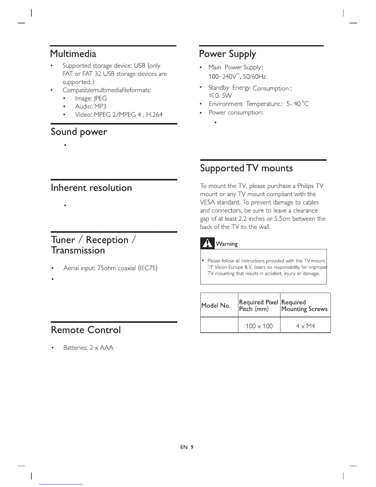 Philips 32PHT5200 - Product Technical Specifications; Multimedia File Format Support; Audio, Display, and Battery Specs; Tuner Reception System Details