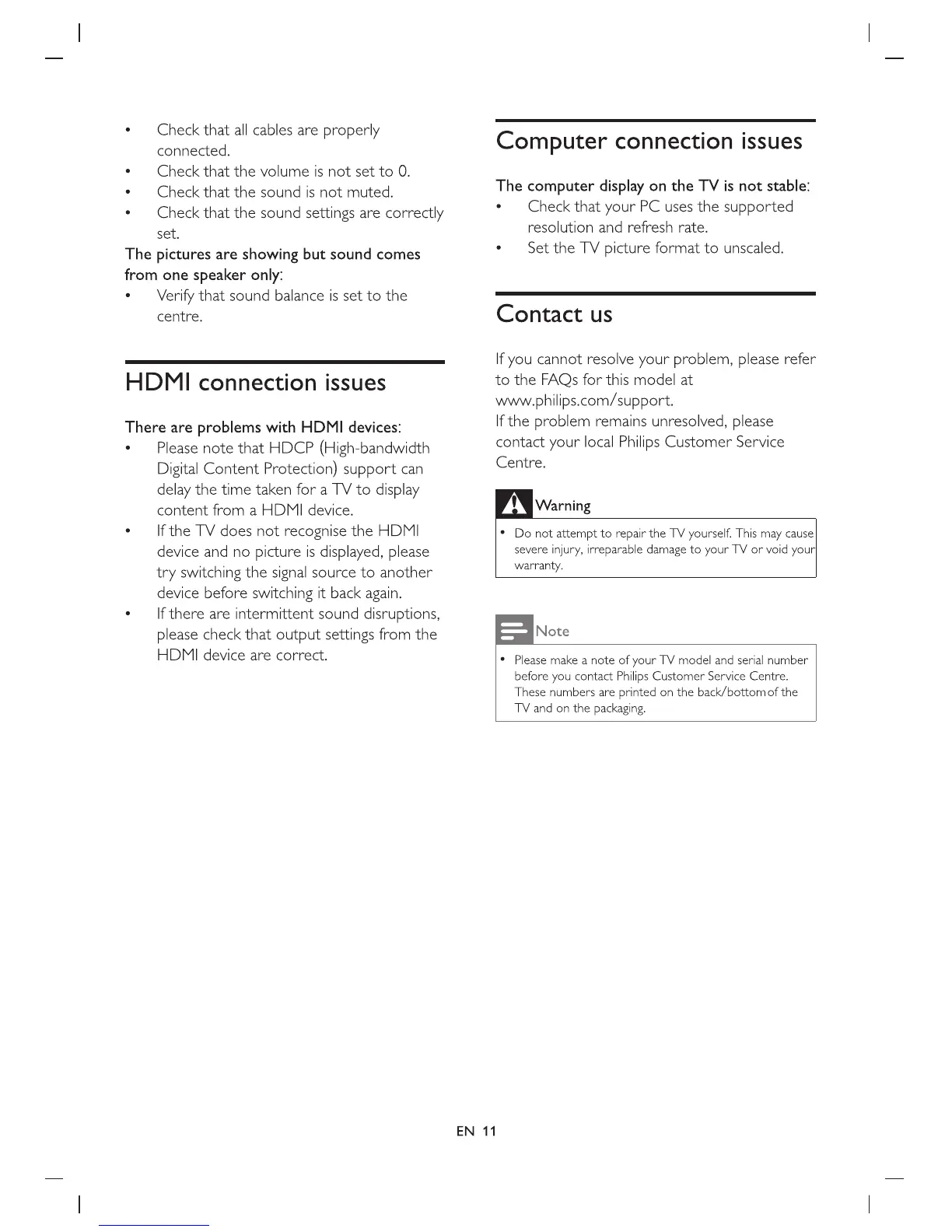 Philips 32PHT5200 - Advanced Troubleshooting and Support; HDMI Connectivity Troubleshooting; Computer Display Stability Issues; Contacting Philips Customer Support