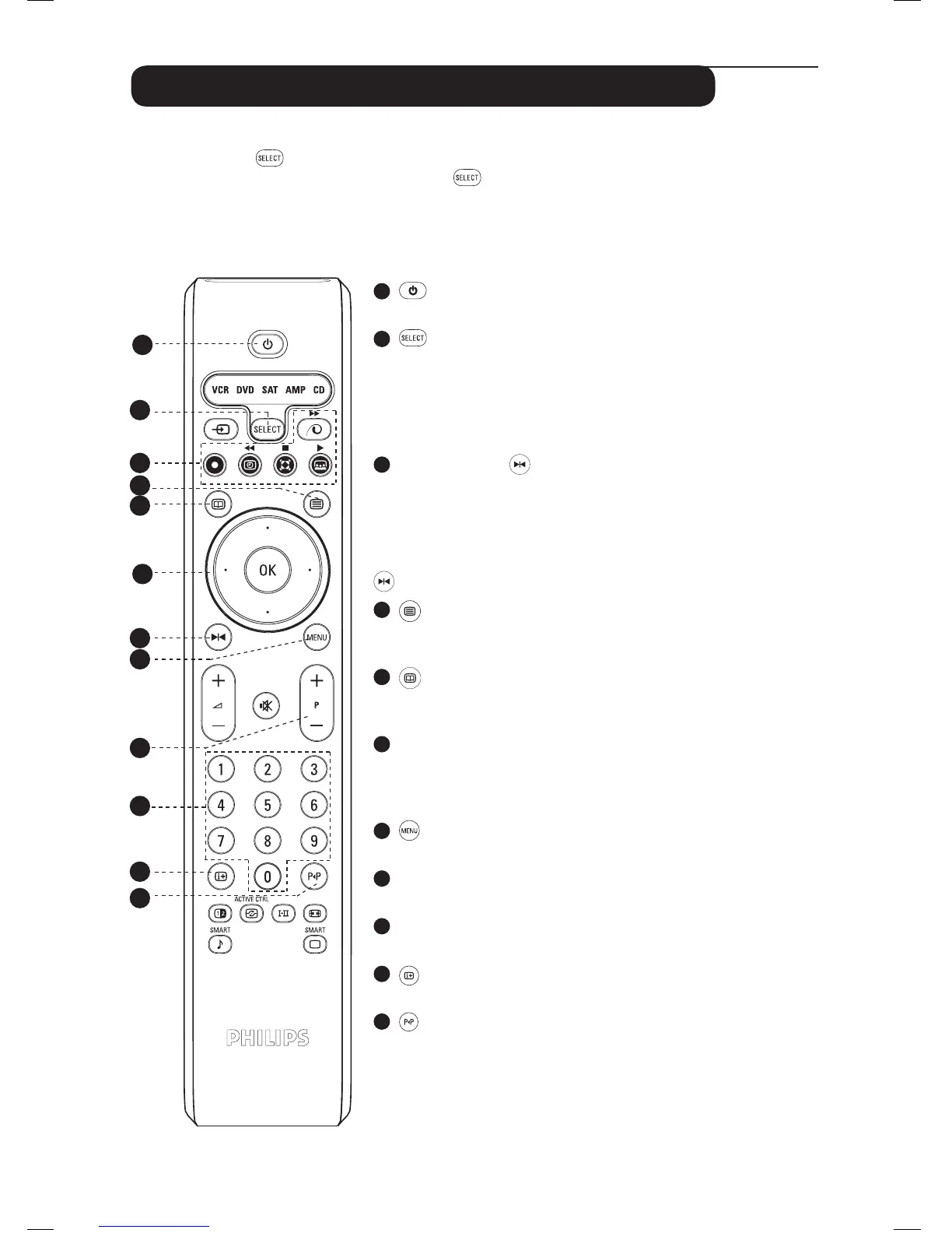 This remote control operates the following Philips equipment: VCR, DVD, SAT (RC6), AMP (+ TUNER)