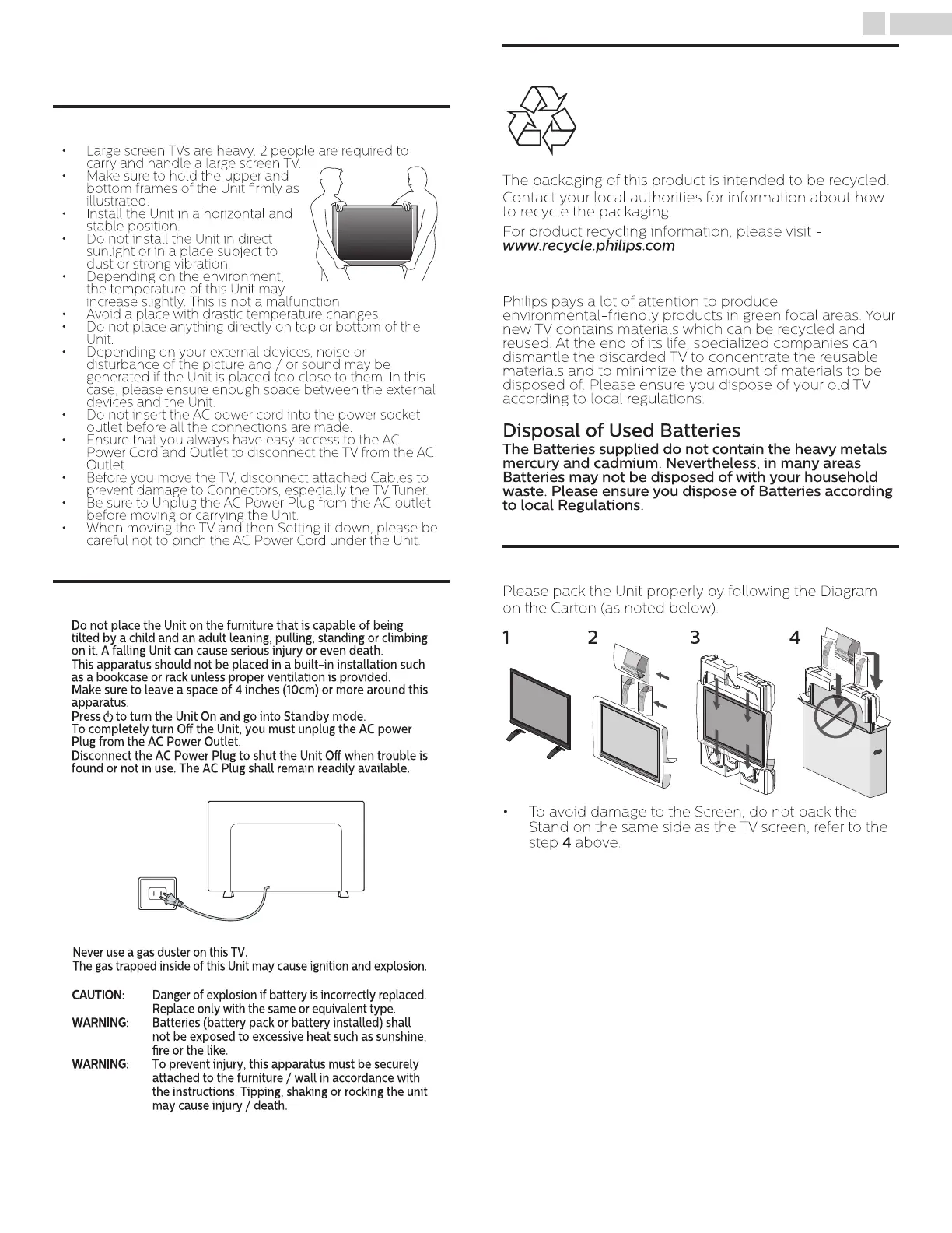 • Large screen TVs are heavy. 2 people are required to