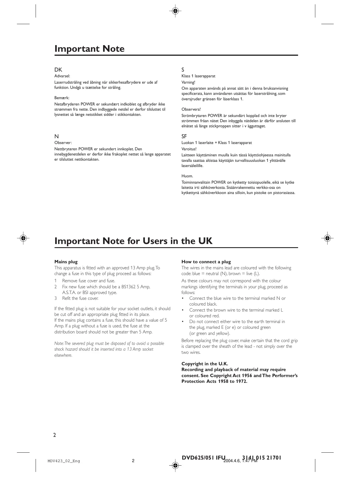 DVD625/051 IFU 3141 015 21701