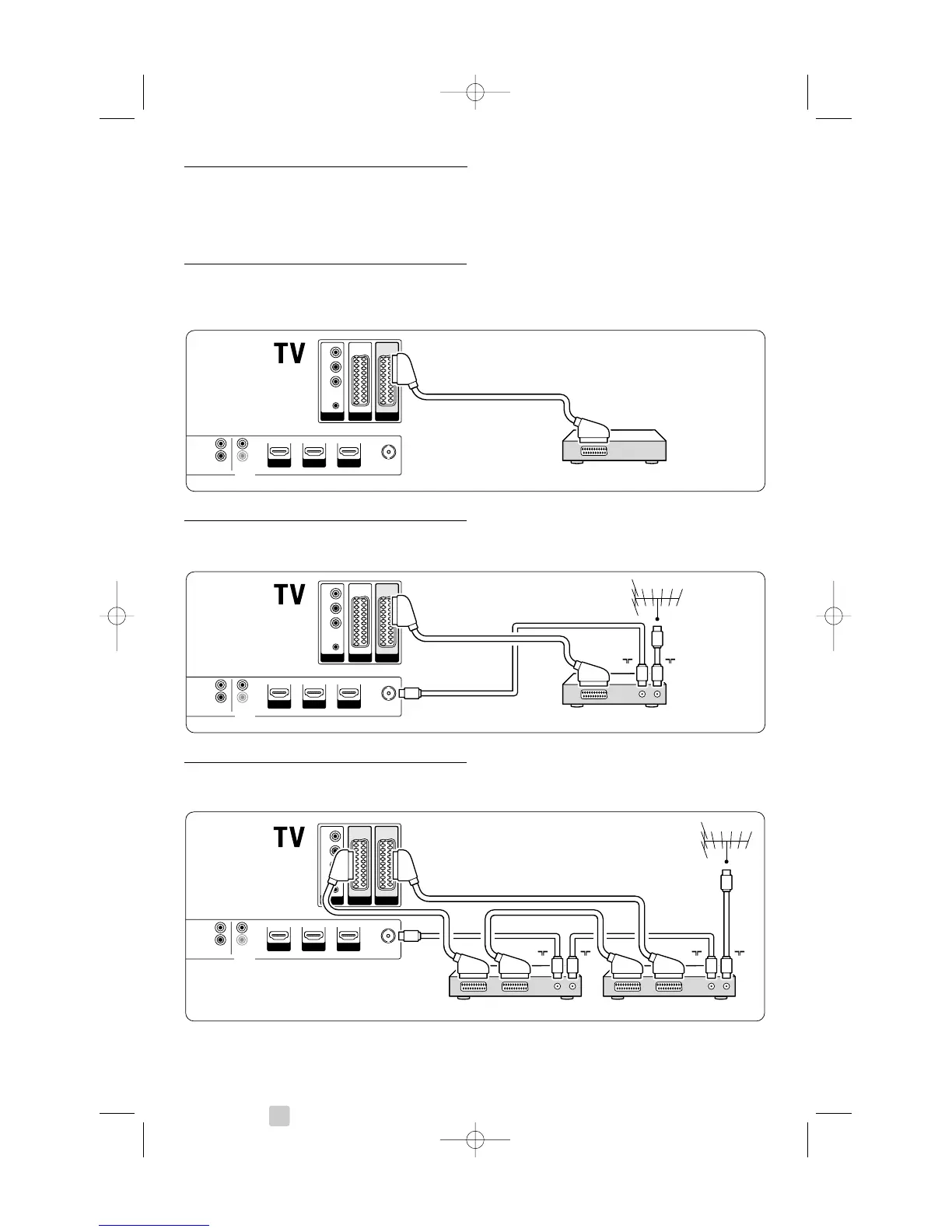 Use 3 scart cables and 3 antenna cables.