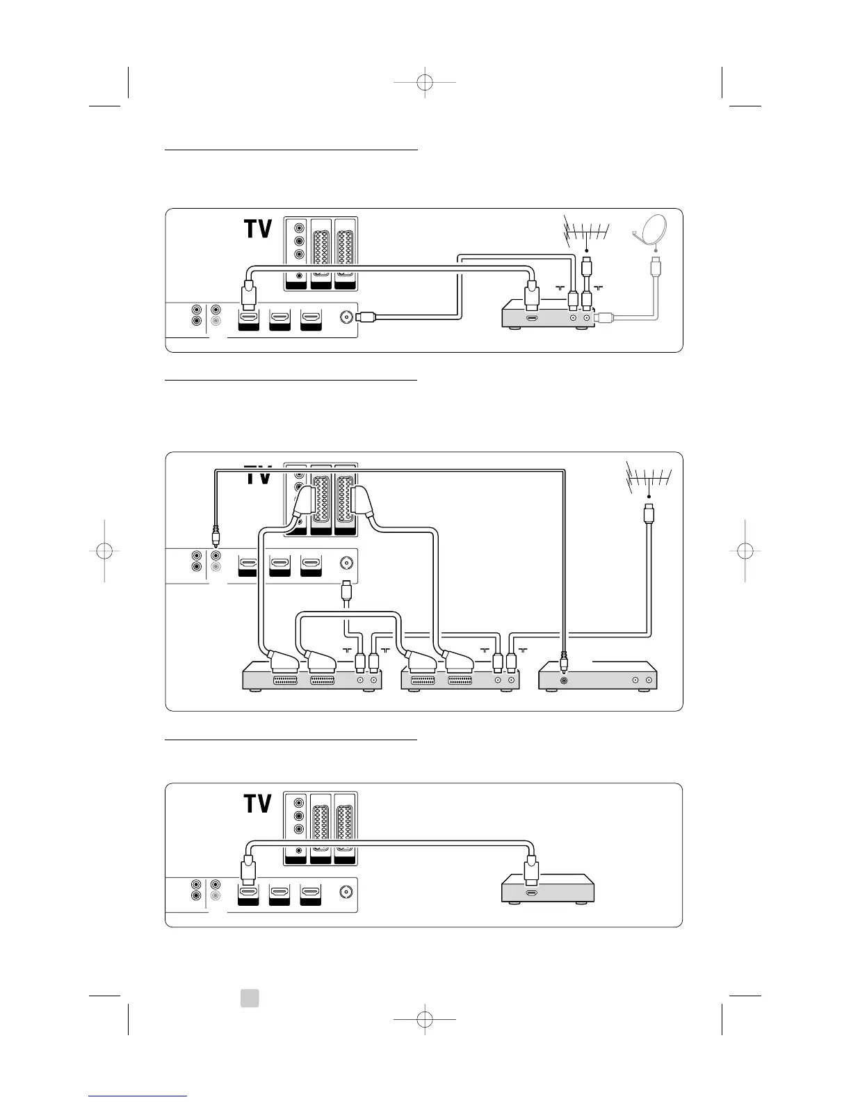 Use 3 scart cables, 3 antenna cables and 1 audio