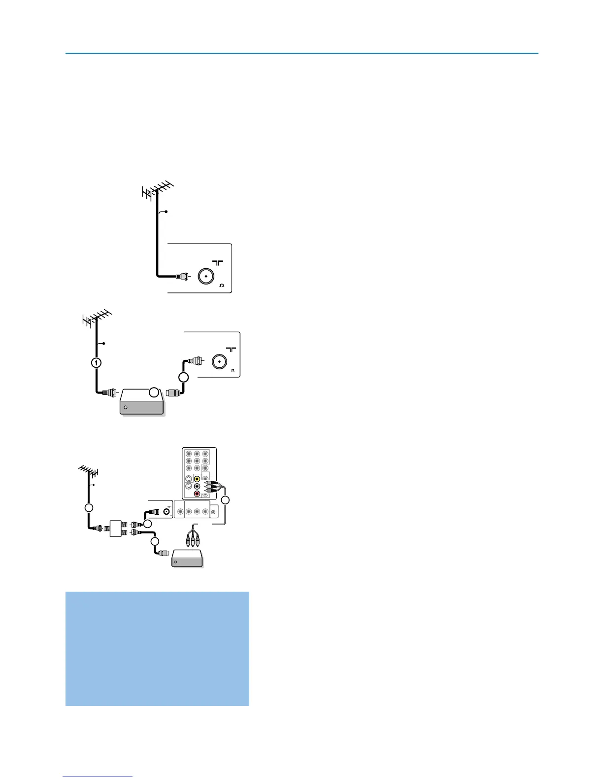• Connect the incoming cable TV signal 1 to a signal splitter (not