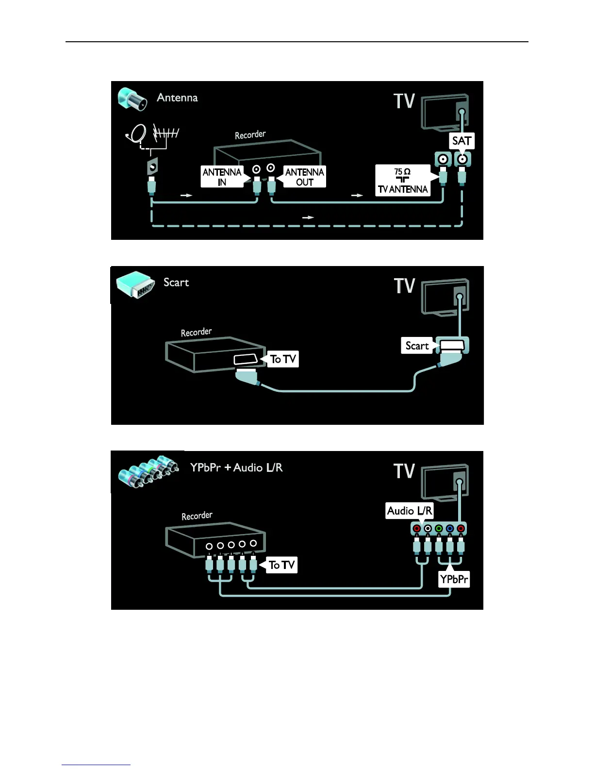 Connect the recorder with a component cable (Y Pb Pr) and an audio L/R cable to the TV.