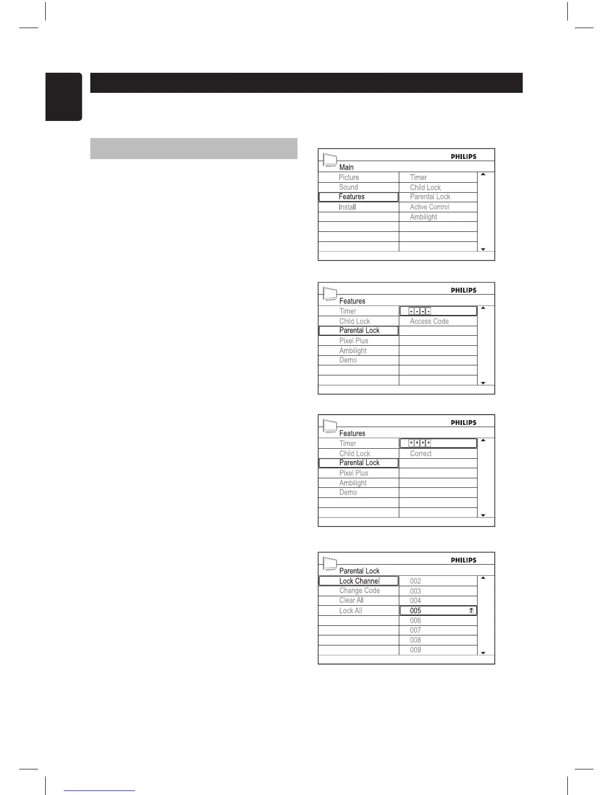 The Parental Lock feature lets you control the type of TV programs that can be accessed