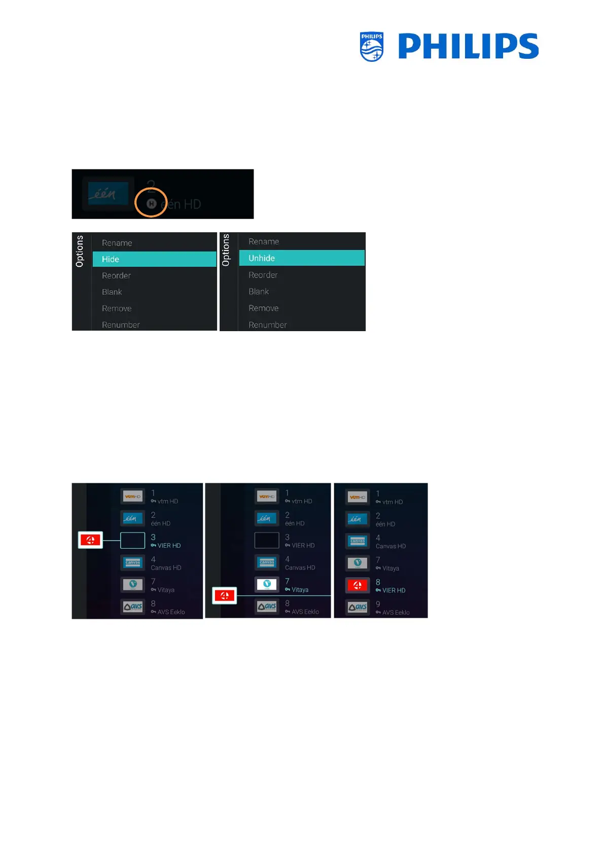 channel list, select the channel you want to hide or unhide. Press ”Options”, select [Hide] (when