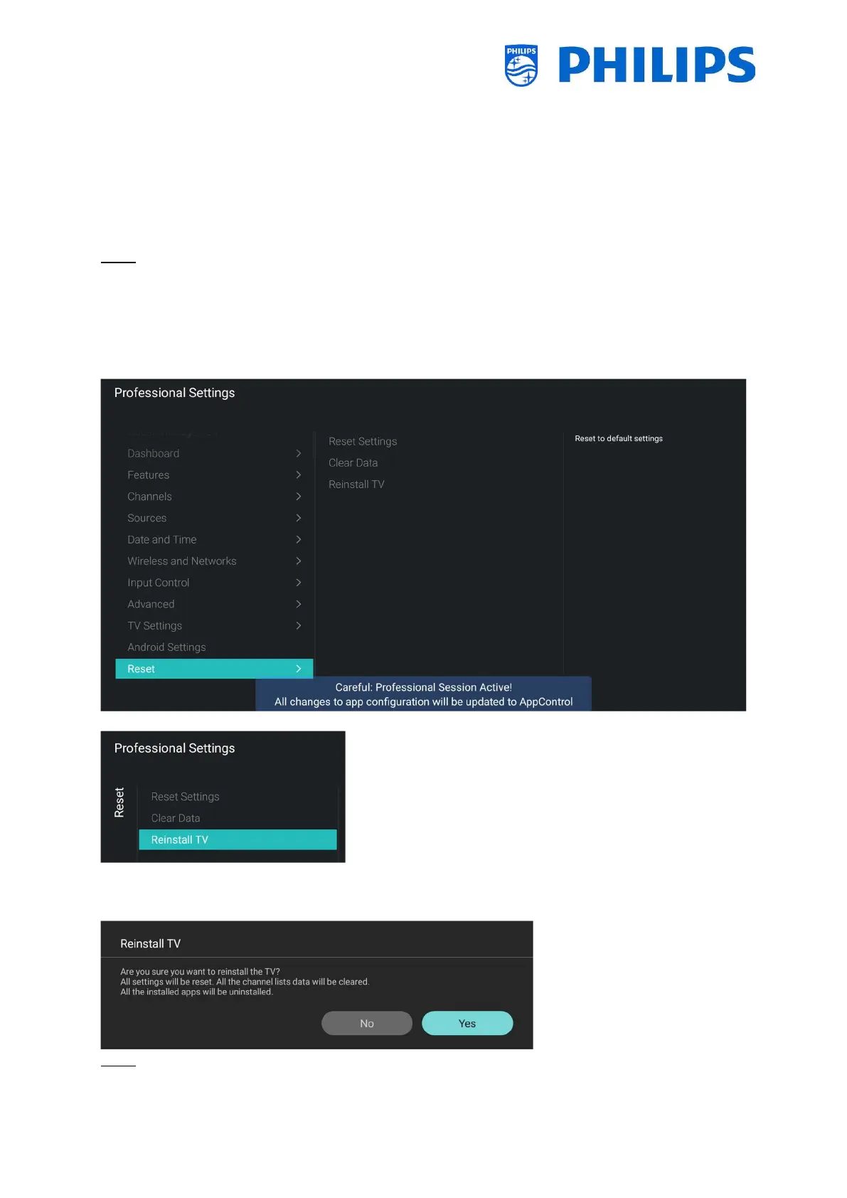 Navigate to the [Reset] menu. Navigate to the [Reinstall TV] menu.