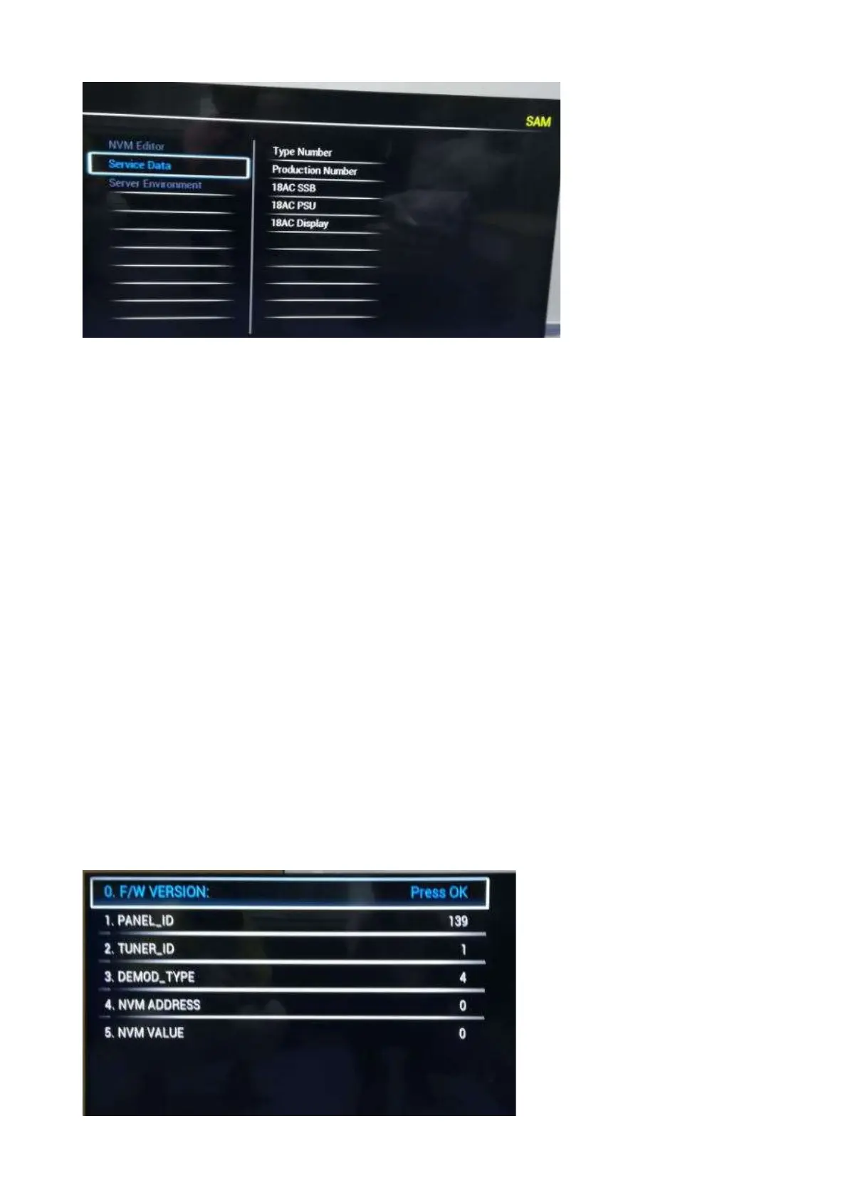 Remark: Under main menu “NVM editor”, select “Service Data”, you can use the UP/DOWN keys to view and change the set Type number, the set