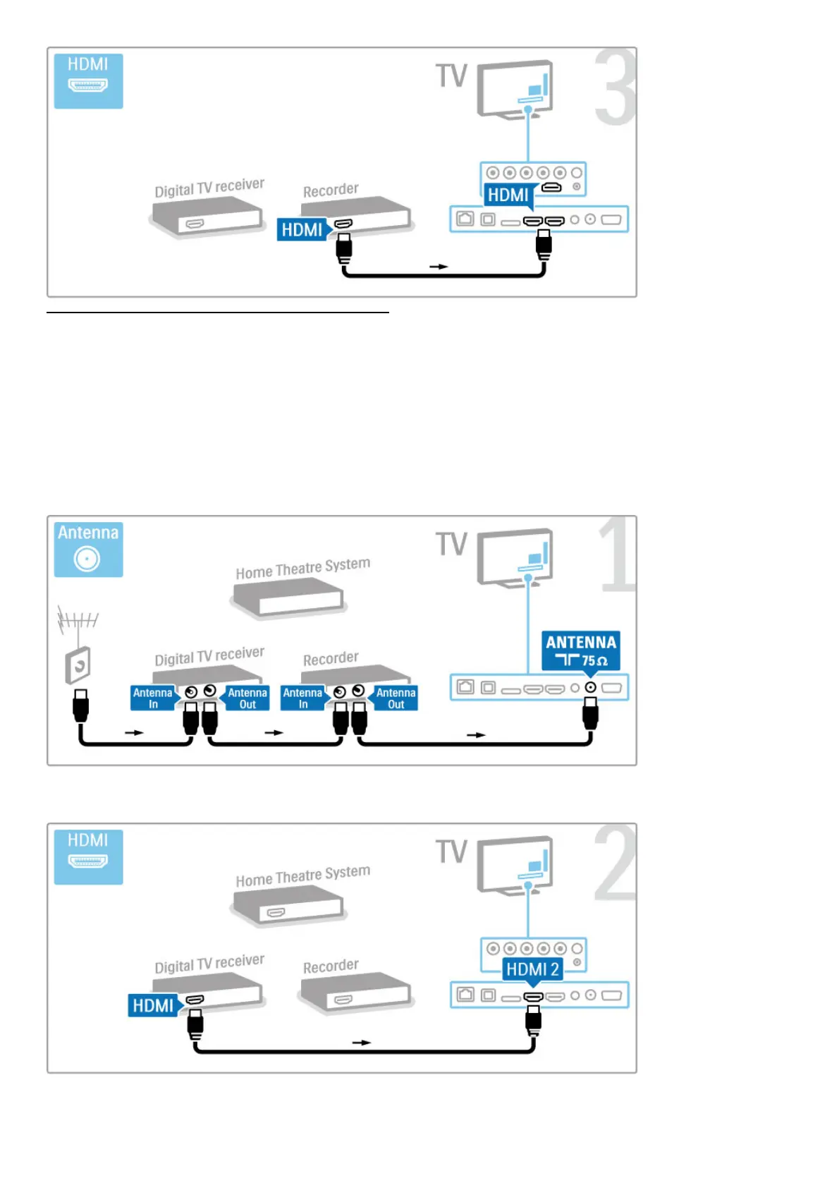 First, use 3 antenna cables to connect the devices to the TV.