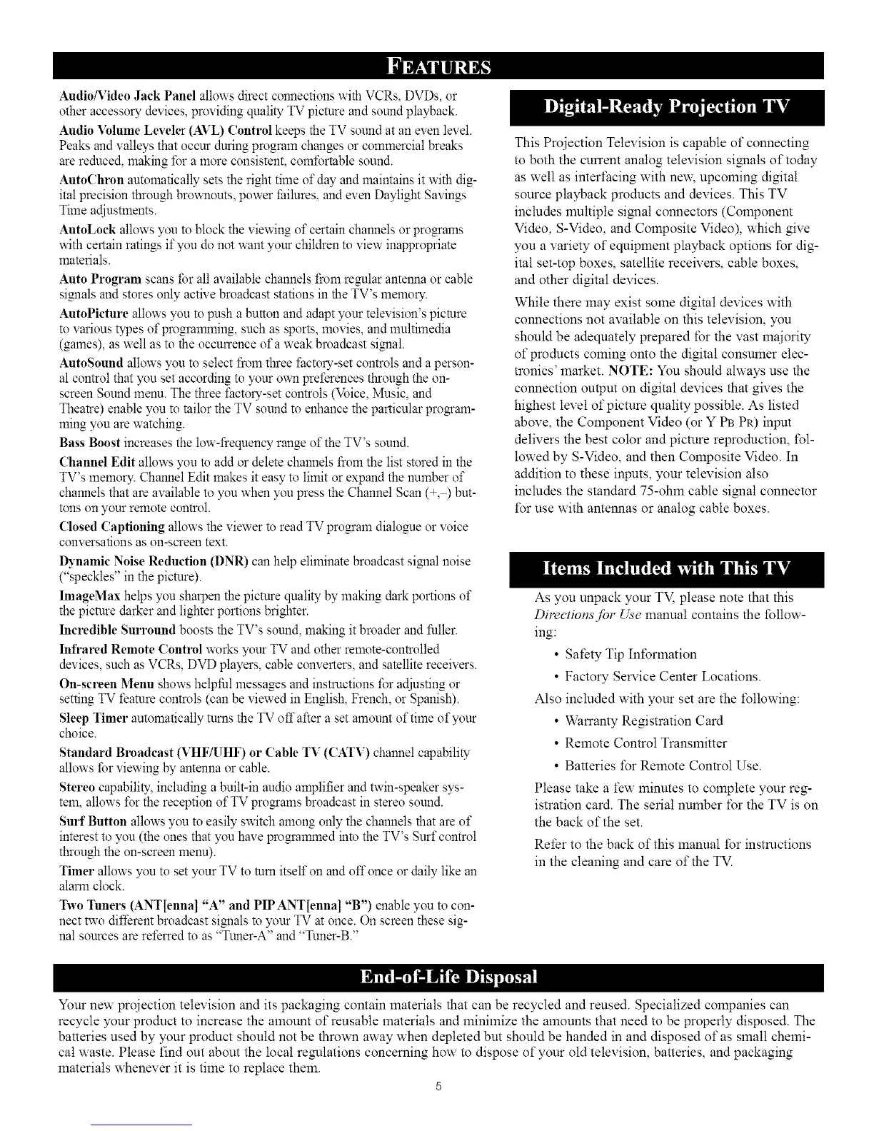 Your new projection television and its packaging contain materials that can be recycled and reused. Specialized companies can