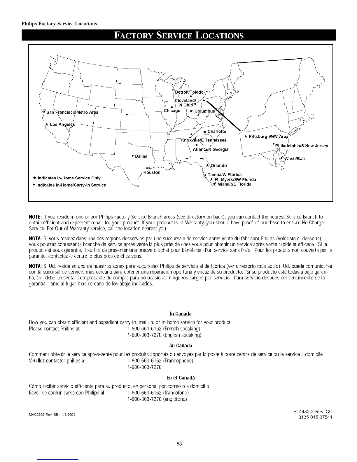 NOTE:If you reside in one of our Philips Factory Service Branch areas(see directory on back), you can contact the nearestService Branch to