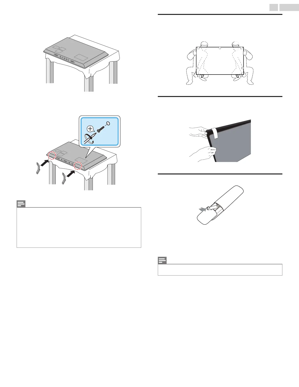 Carefully lift the TV set as shown in the illustration and place it onto a