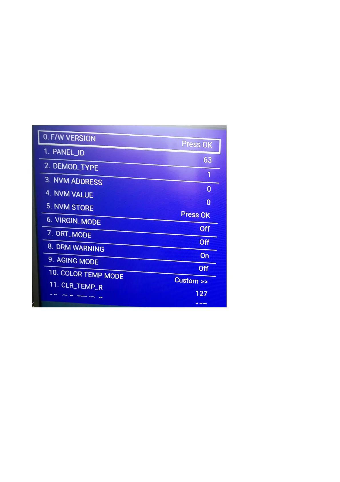 After entering the Factory mode, we can see many items displayed,use the UP/DOWN keys to display the next/previous menu items