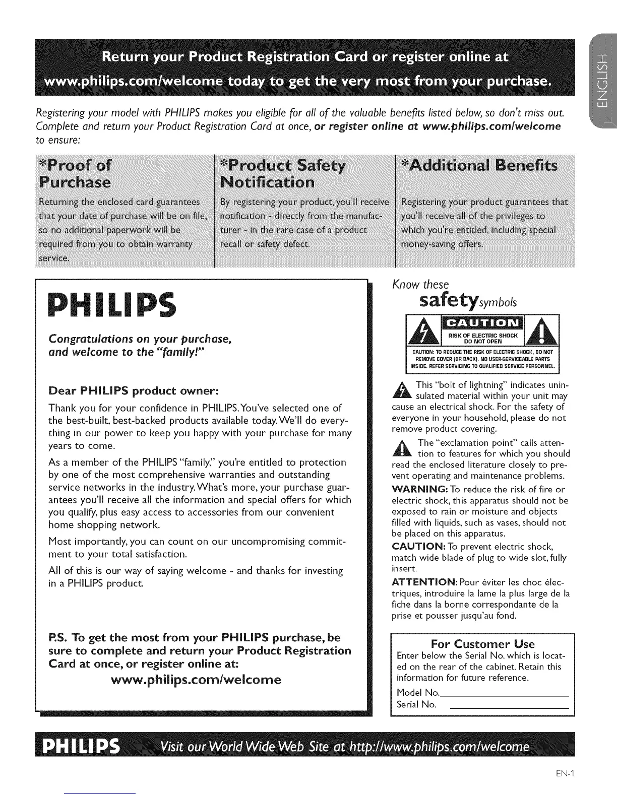 Complete and return your Product Registration Card at once, or register online at www.philips.comlwelcome