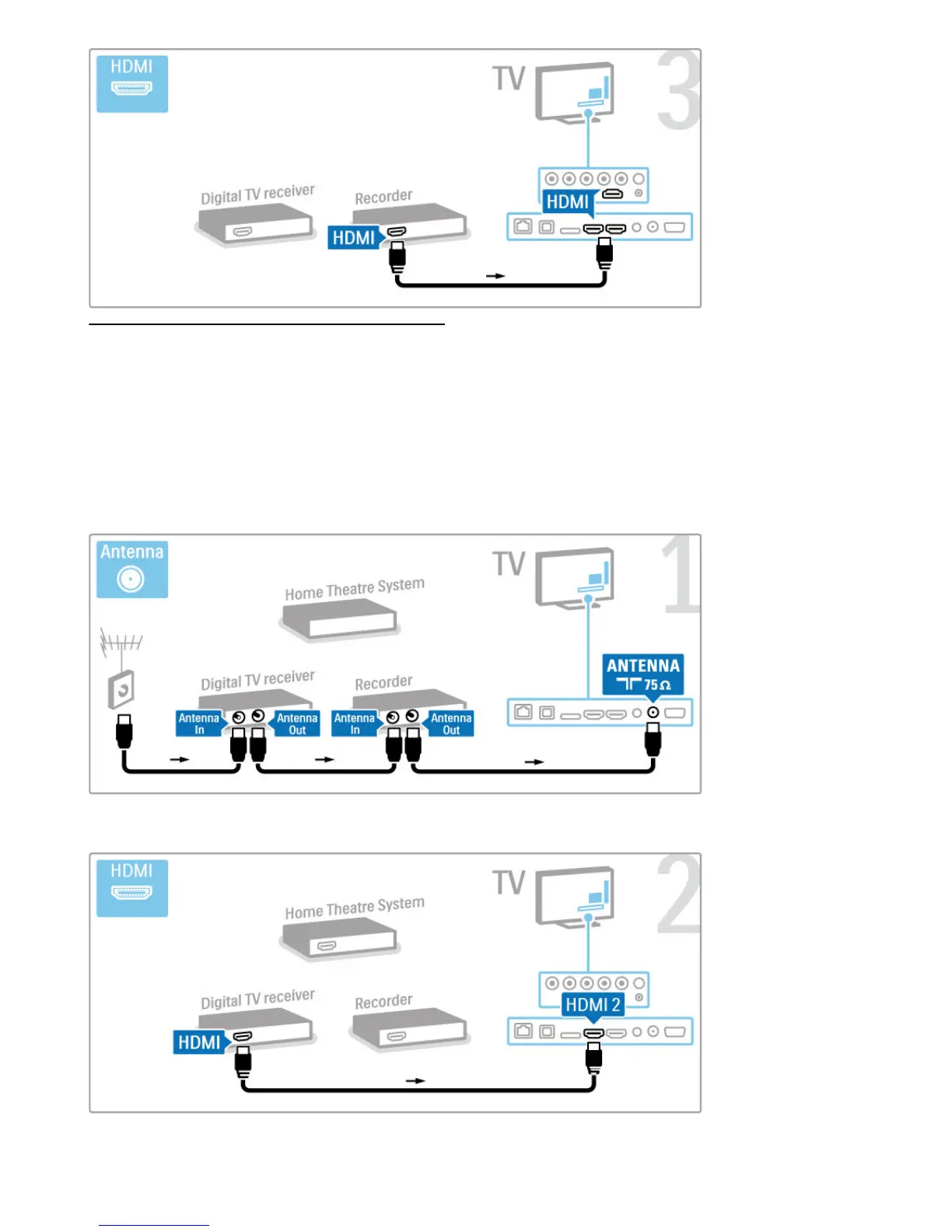 First, use 3 antenna cables to connect the devices to the TV.