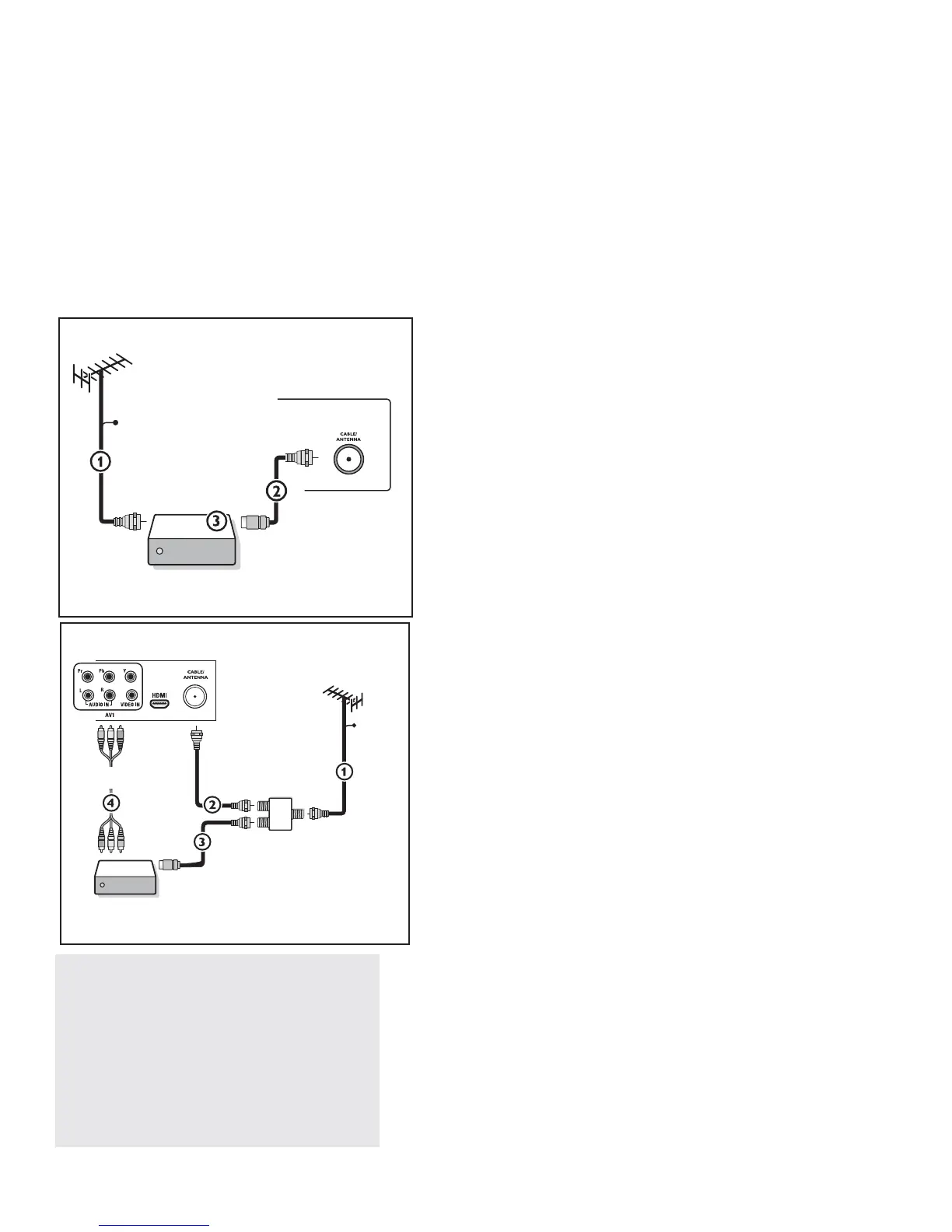 • Conecte la señal de televisión por cable entrante 1 a un divisor de señal (no se