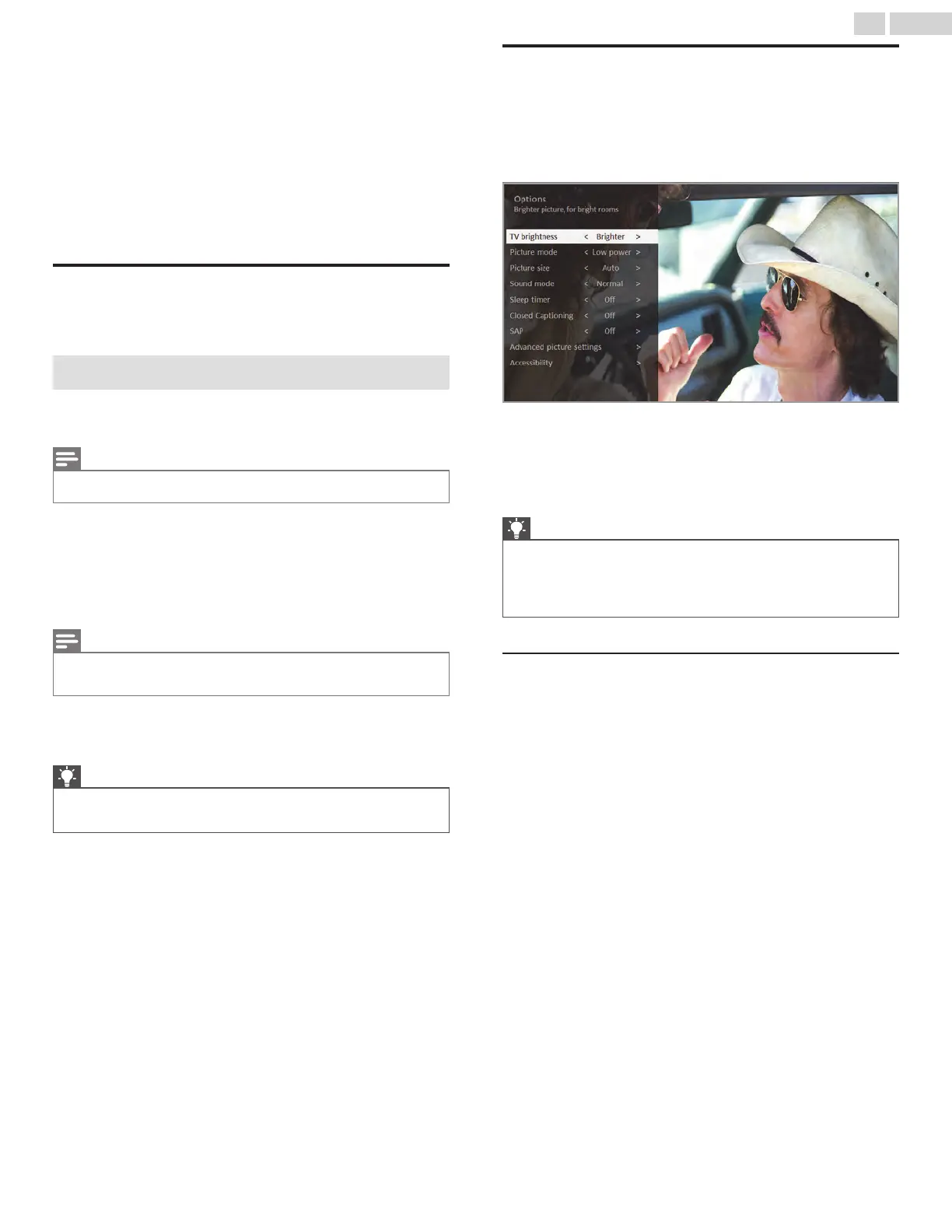 brighter rooms. Increases or decreases the TV’s general brightness