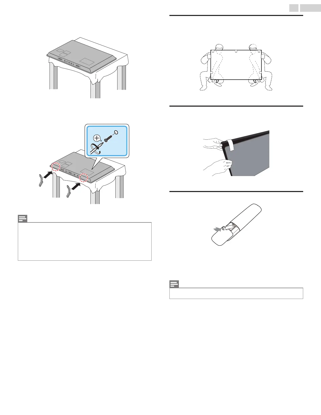 Carefully lift the TV set as shown in the illustration and place it onto a