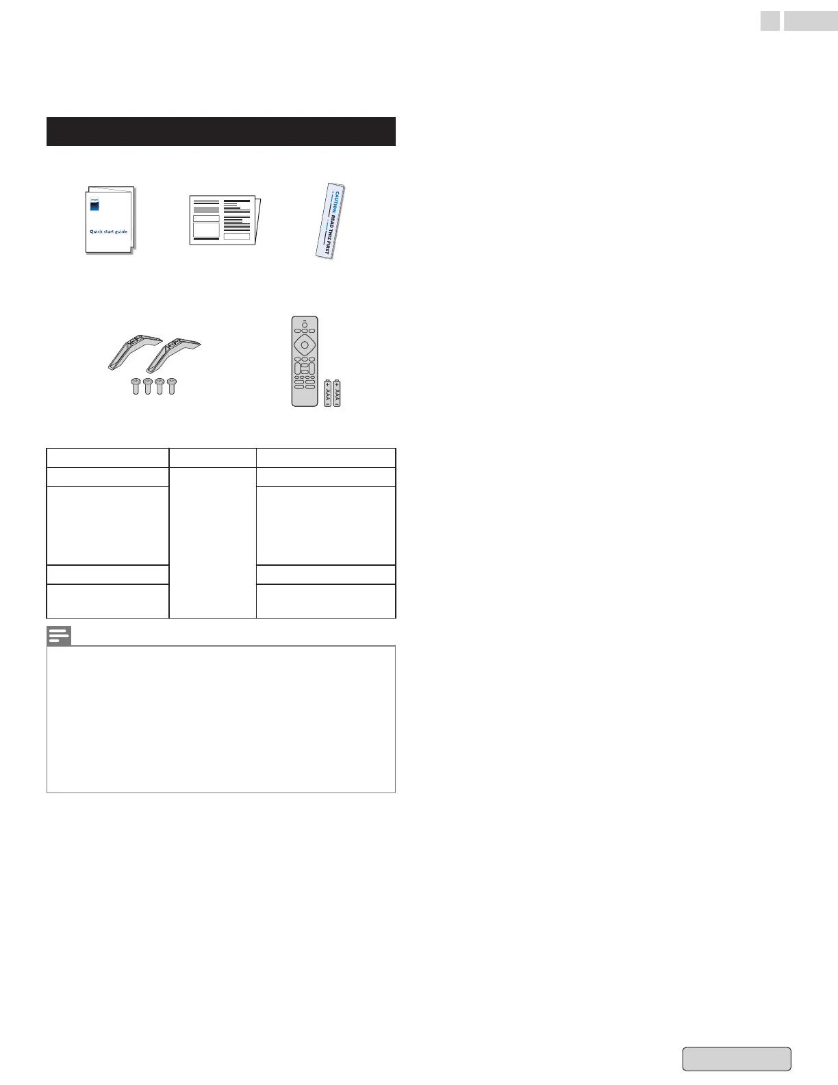 TV base and screws * Remote and Batteries