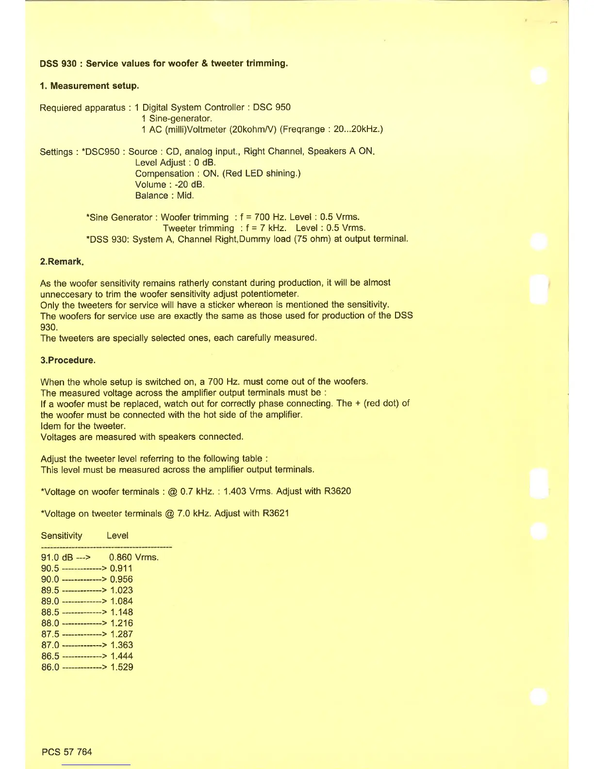 Philips 70DSS930 - SERVICE VALUES FOR TRIMMING; Measurement Setup and Equipment; Trimming Procedure and Voltage Table
