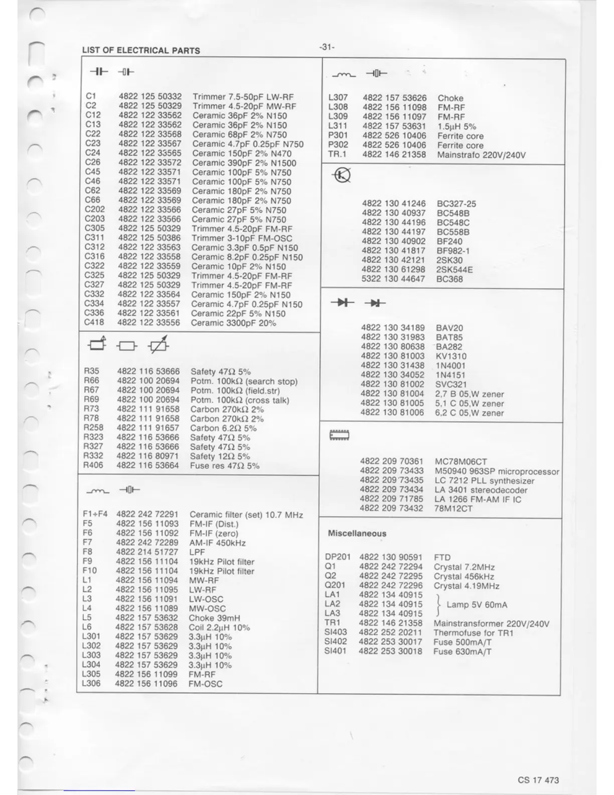 Philips 70FT880 - Electrical Parts List; Passive Electrical Components; Active Electrical Components; Miscellaneous Electrical Components
