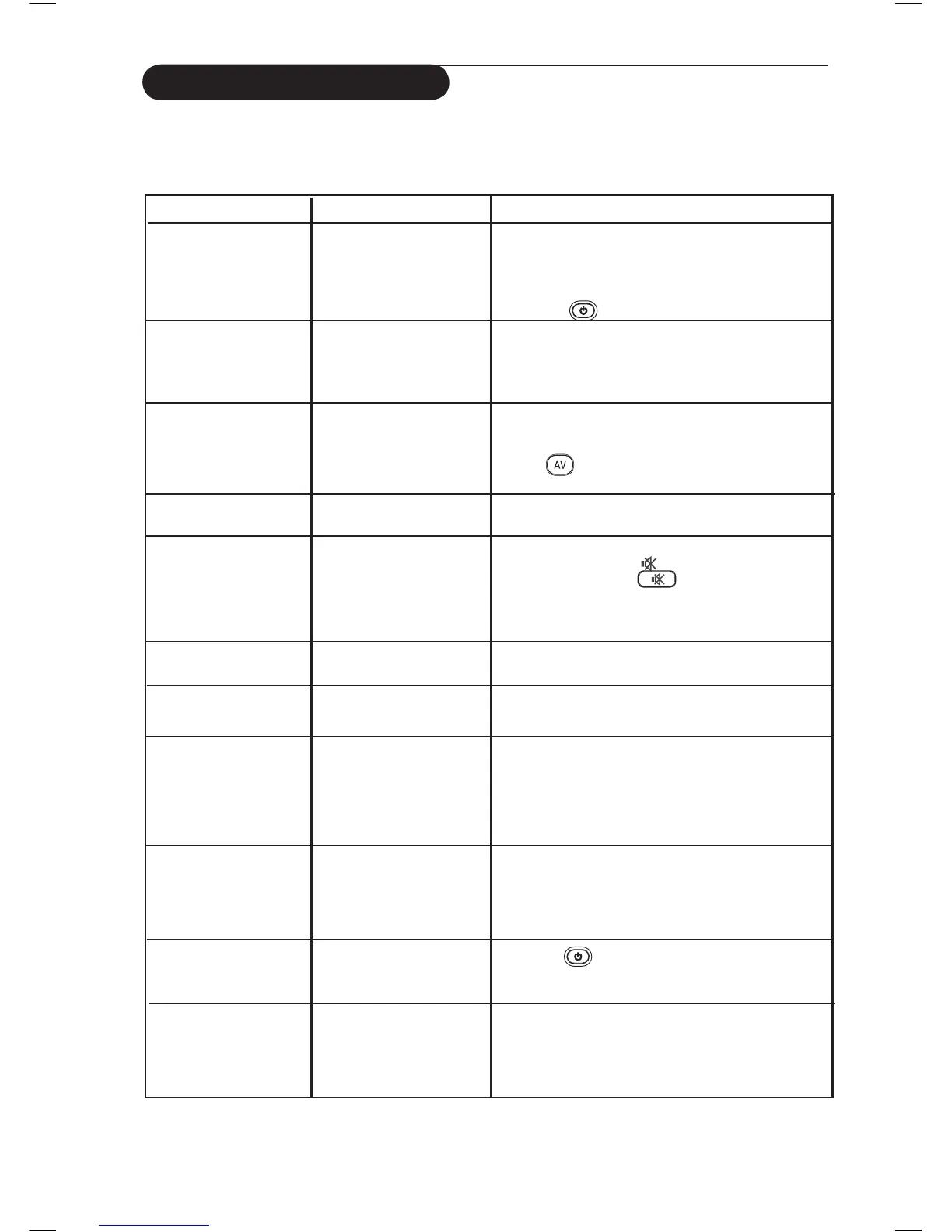 No display on screen • Faulty power supply • Check whether power cord is properly connected