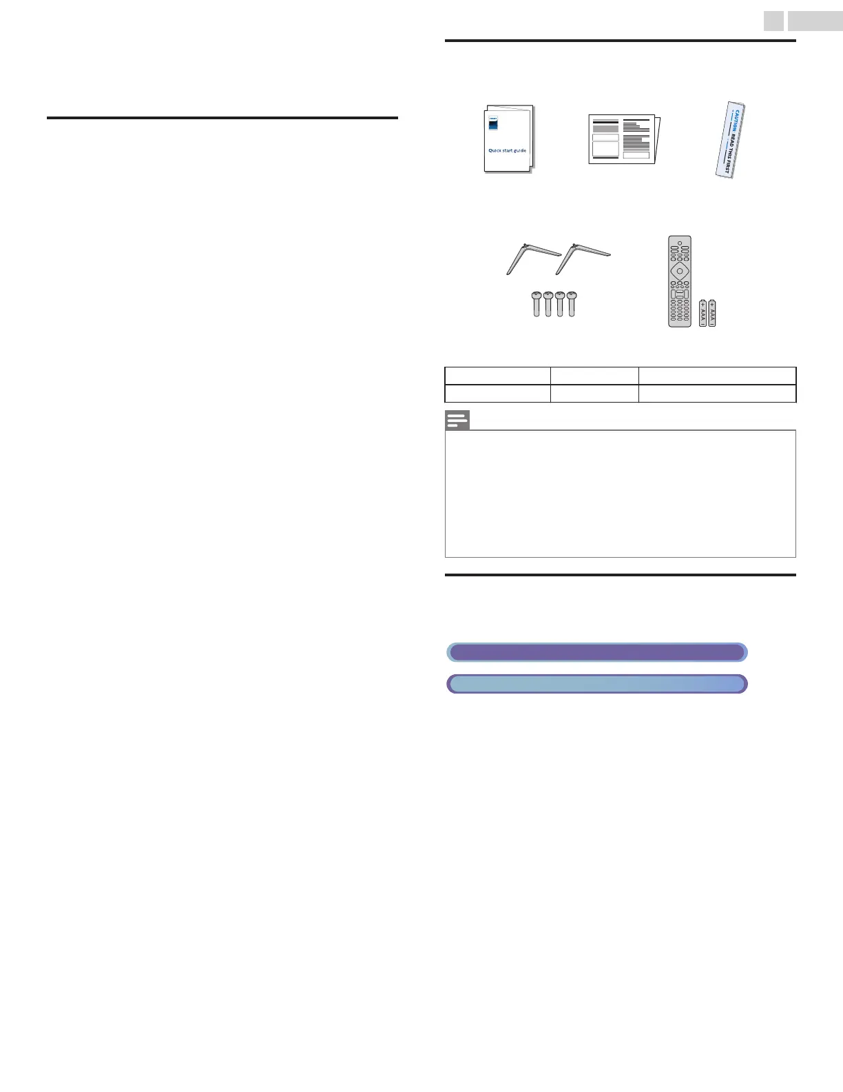 TV base and screws * Remote and Batteries