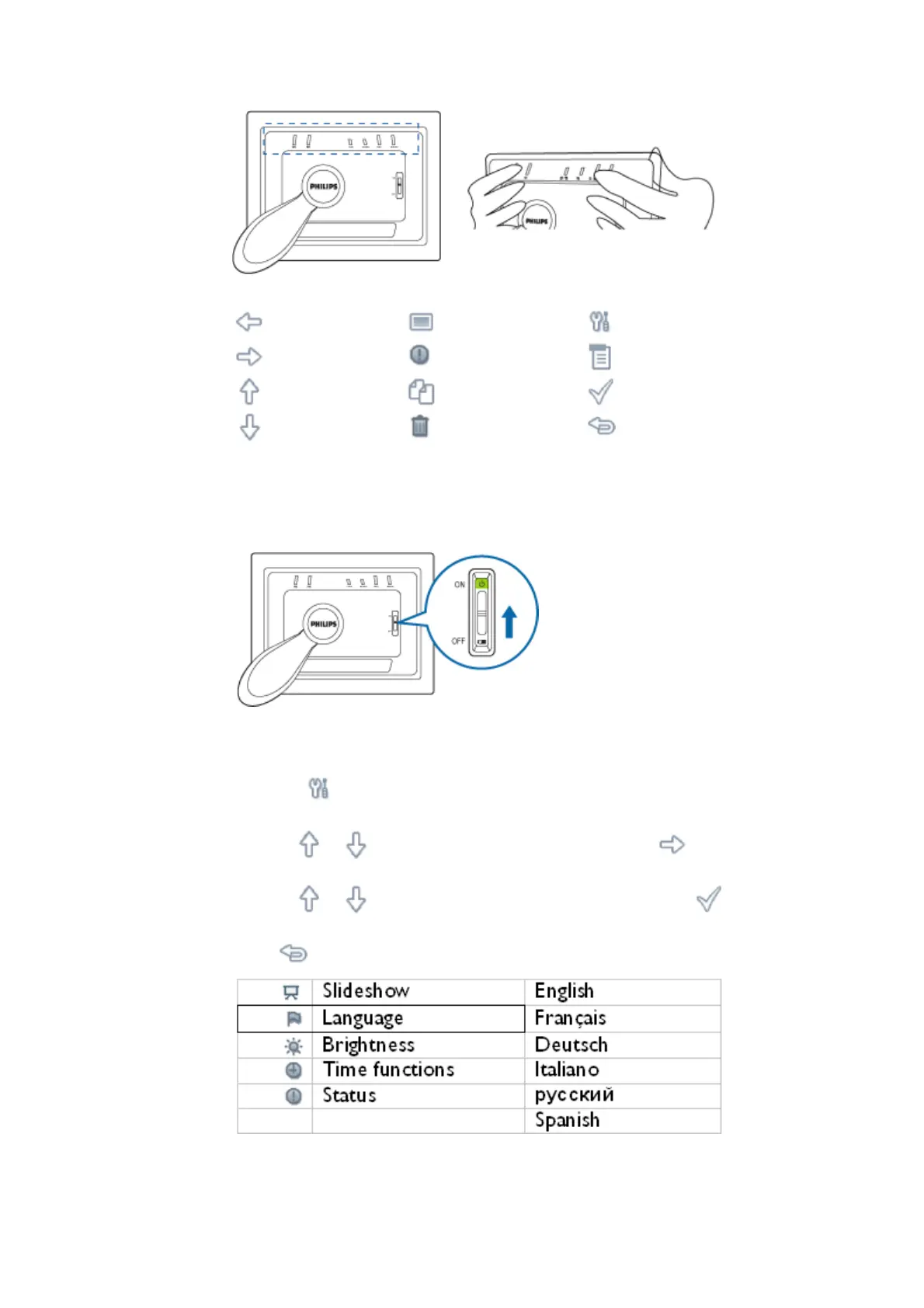 Use the or key to choose your preferred language. Press to