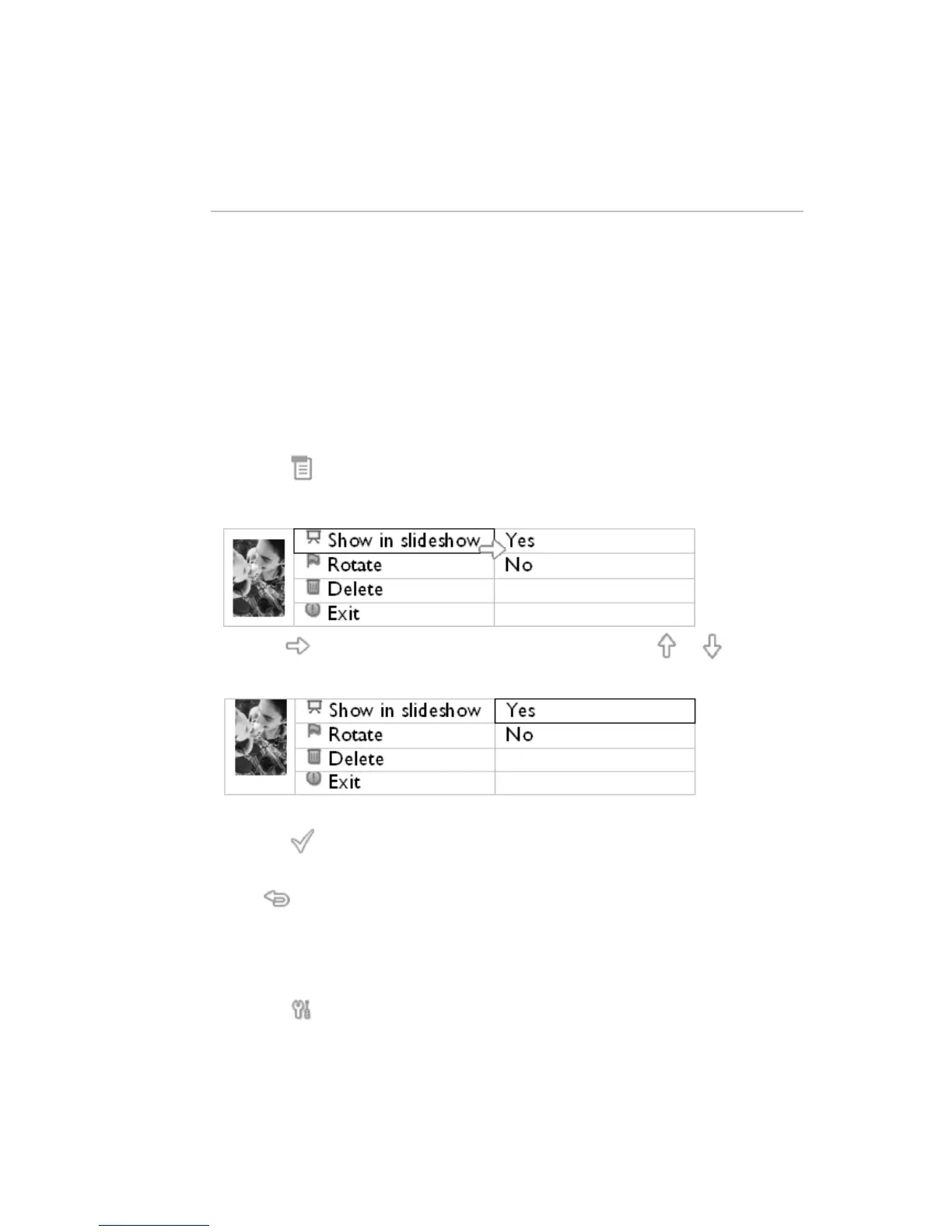 Press the key to select Show in slideshow setting and use the or key to