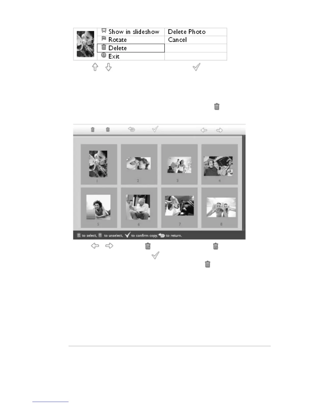 When you delete a photo, PhotoFrame™ will show status and return to Brose mode after