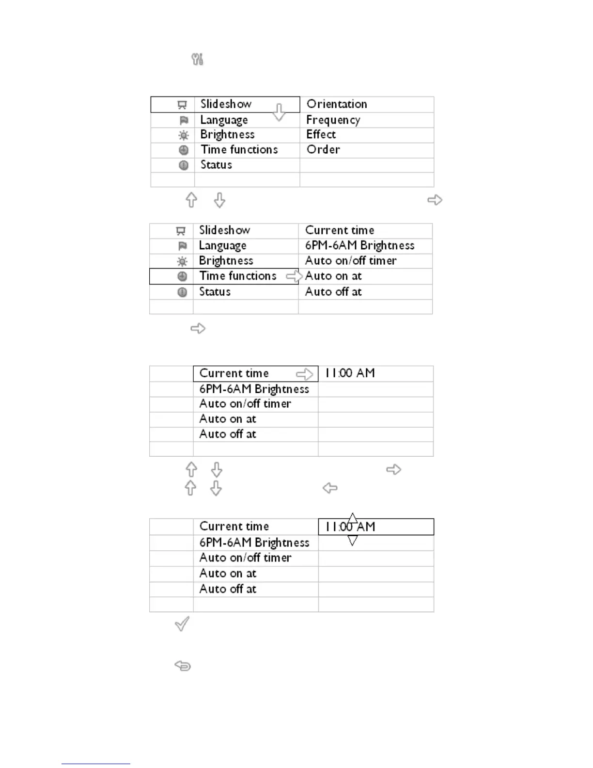Use the or key to set Hours; next then press the key to move to Minutes an