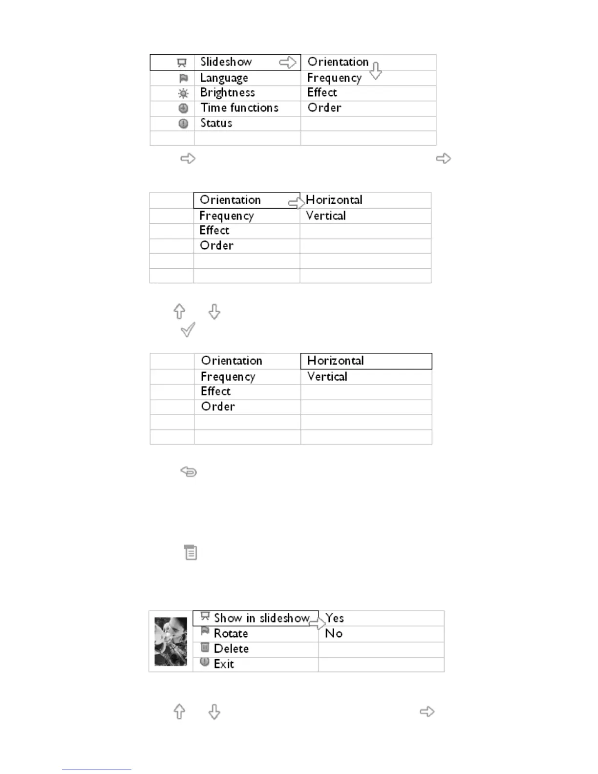Tryk på tasten for at vælge indstillinger for lysbilledshow; tryk på tasten igen,