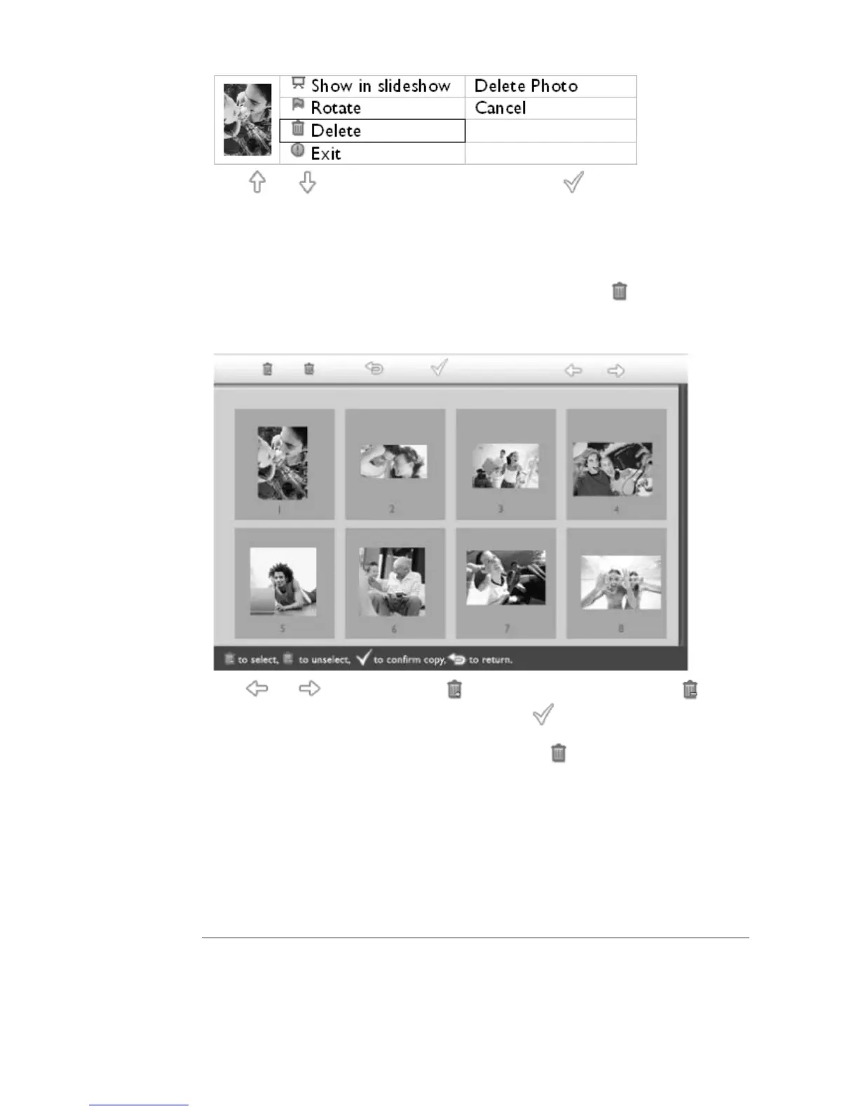 Brug eller tasten for at oplyse slet billede; Tryk på for at bekræfte.