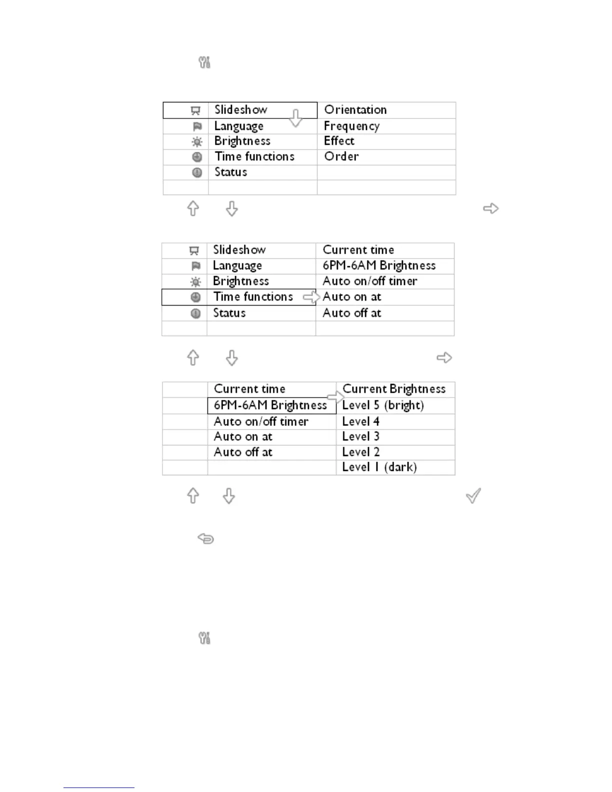 Brug eller tasten for at ændre niveauet for lysstyrke og tryk på for at